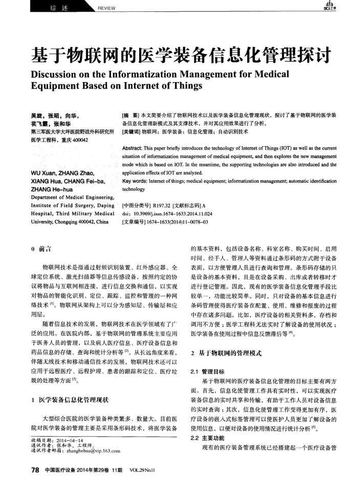本站正式发布了《基于物联网的医学装备信息化管理探讨》文档,文档详细内容可下载阅读。 声明:本站所有文章,如无特殊说明或标注,均为本站原创发布。任何个人或组织,在未征得本站同意时,禁止复制、盗用、采集、发布本站内容到任何网站、书籍等各类媒体平台。如若本站内容侵犯了原著者的合法权益,可联系我们进行处理。