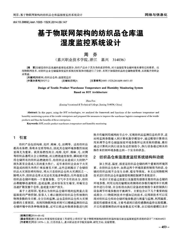 本站正式发布了《基于物联网架构的纺织品仓库温湿度监控系统设计》文档,文档详细内容可下载阅读。 声明:本站所有文章,如无特殊说明或标注,均为本站原创发布。任何个人或组织,在未征得本站同意时,禁止复制、盗用、采集、发布本站内容到任何网站、书籍等各类媒体平台。如若本站内容侵犯了原著者的合法权益,可联系我们进行处理。