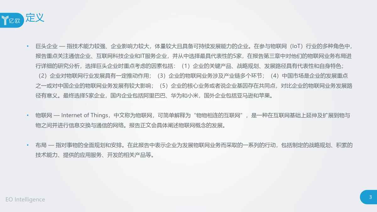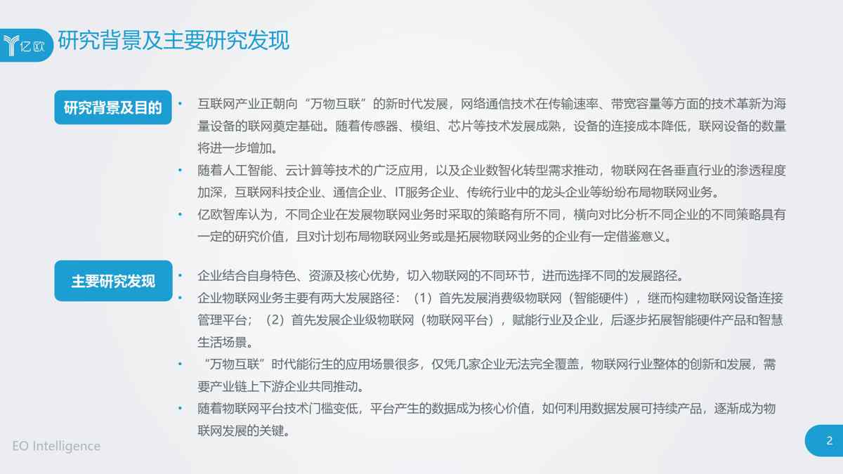 物联网设备不断增多的同时,网络及通信技术也在迭代发展,以支持海量设备同时联网。现阶段,IoT设备连接依赖于智能手机或WiFi,为提高设备的灵活性和便携性,电源、功耗、操作系统等方面的技术升级正在进行。同时,物联网行业产品和应用的创新发展依 赖相关底层技术,例如数据存储需要云计算技术的支持,IoT设备智能化需要AI、大数据分析技术的支持等。通信企业在物联网专有网络及基础设施建设上具备核心优势,掌握物联网芯片、LPWAN等核心技术,代表企业华为在智能硬件、物 联网操作系统、物联网开放平台等方面也有较深布局;互联网科技企业具备庞大的用户群(个体消费者或企业)及技术优势,结合企 业基因及战略规划布局物联网业务,重点发展领域分为智能硬件及应用场景、物联网平台及服务两类;IT服务类企业的核心优势是云 服务业务;运营商基于数量庞大的物联网连接设备发展管理平台;垂直行业重点深挖物联网在所在行业的创新应用及运营。