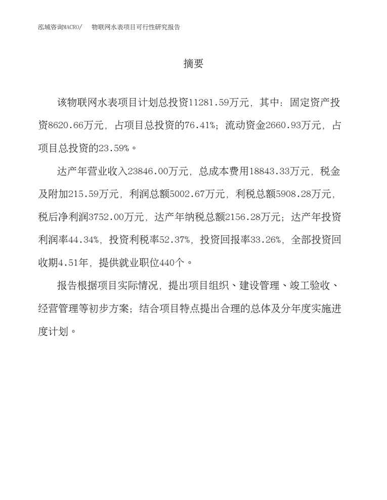 不久前,最新文档《(立项模板)物联网水表项目可行性研究报告(总投资11000万元)》全文正式在本站发布,感兴趣的用户可以下载阅读。 声明:本站所有文章,如无特殊说明或标注,均为本站原创发布。任何个人或组织,在未征得本站同意时,禁止复制、盗用、采集、发布本站内容到任何网站、书籍等各类媒体平台。如若本站内容侵犯了原著者的合法权益,可联系我们进行处理。