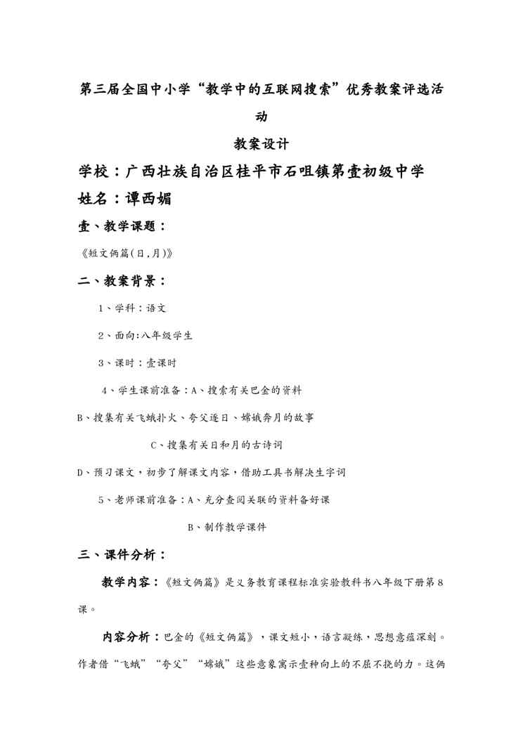 本站正式发布了《(物联网)第三届全国中小学教学中的互联网搜索优秀教案评选活动参赛教案》文档,文档详细内容可下载阅读。 声明:本站所有文章,如无特殊说明或标注,均为本站原创发布。任何个人或组织,在未征得本站同意时,禁止复制、盗用、采集、发布本站内容到任何网站、书籍等各类媒体平台。如若本站内容侵犯了原著者的合法权益,可联系我们进行处理。