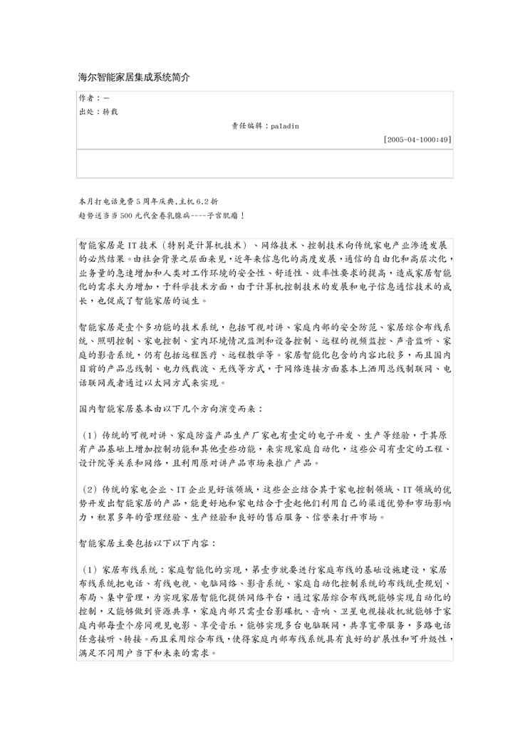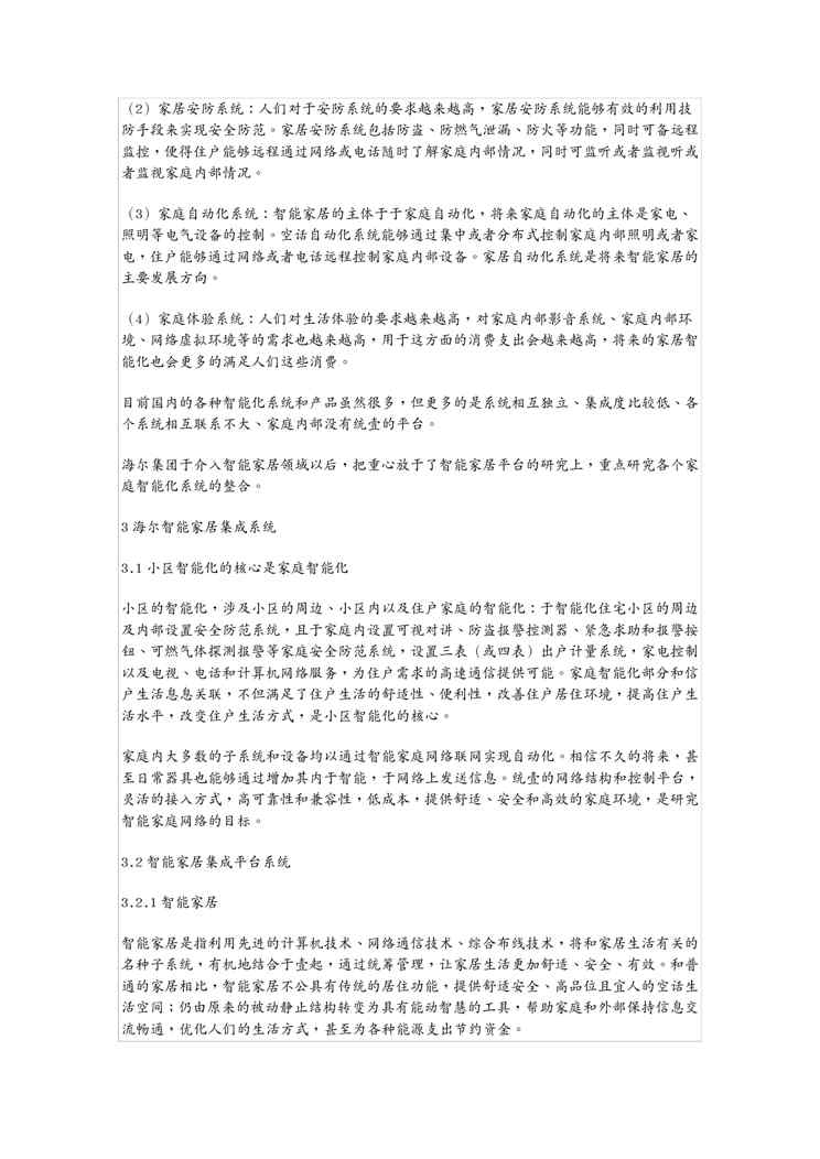 本站资深用户发布了最新的《(物联网)海尔智能家居集成系统简介》文档,以下内容为预览,详细内容可下载阅读。 声明:本站所有文章,如无特殊说明或标注,均为本站原创发布。任何个人或组织,在未征得本站同意时,禁止复制、盗用、采集、发布本站内容到任何网站、书籍等各类媒体平台。如若本站内容侵犯了原著者的合法权益,可联系我们进行处理。
