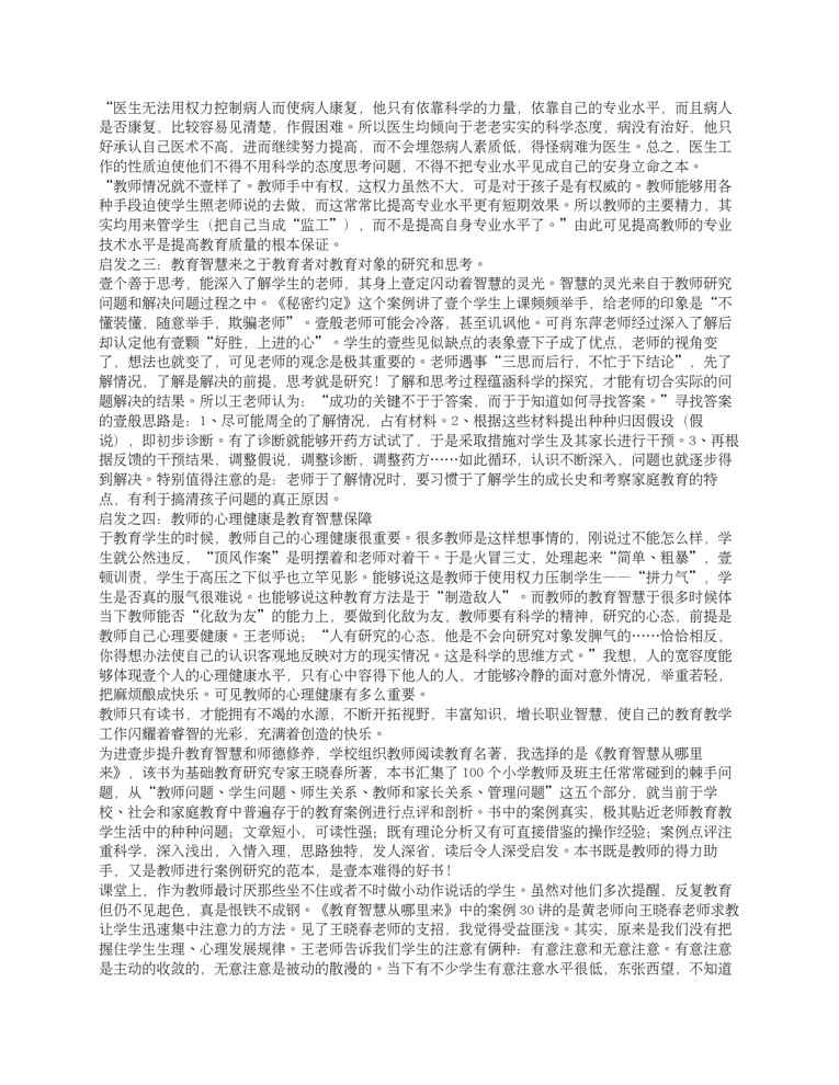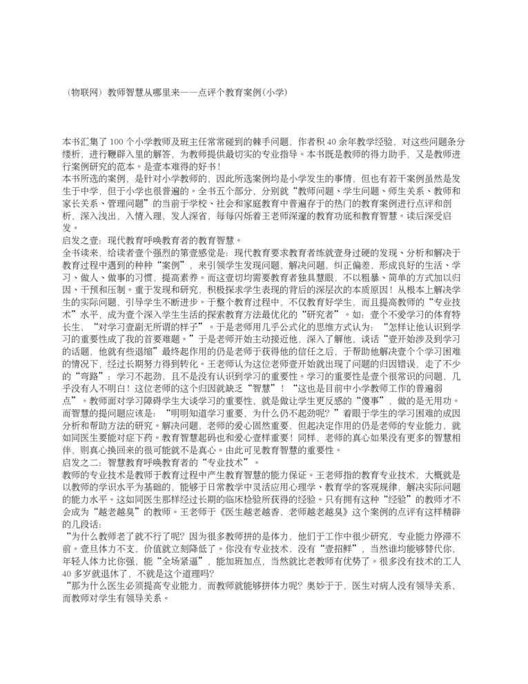 本站资深用户发布了最新的《(物联网)教师智慧从哪里来——点评个教育案例(小学)》文档,以下内容为预览,详细内容可下载阅读。 声明:本站所有文章,如无特殊说明或标注,均为本站原创发布。任何个人或组织,在未征得本站同意时,禁止复制、盗用、采集、发布本站内容到任何网站、书籍等各类媒体平台。如若本站内容侵犯了原著者的合法权益,可联系我们进行处理。