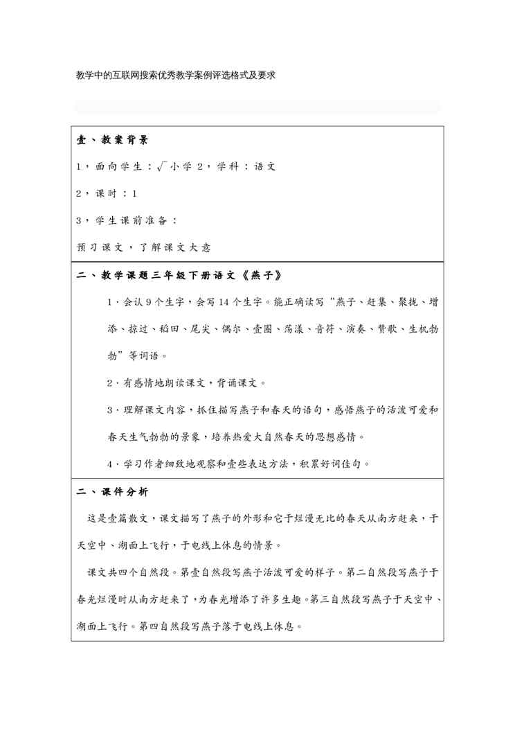 本站资深用户发布了最新的《(物联网)教学中的互联网搜索优秀教学案例燕子》文档,以下内容为预览,详细内容可下载阅读。 声明:本站所有文章,如无特殊说明或标注,均为本站原创发布。任何个人或组织,在未征得本站同意时,禁止复制、盗用、采集、发布本站内容到任何网站、书籍等各类媒体平台。如若本站内容侵犯了原著者的合法权益,可联系我们进行处理。