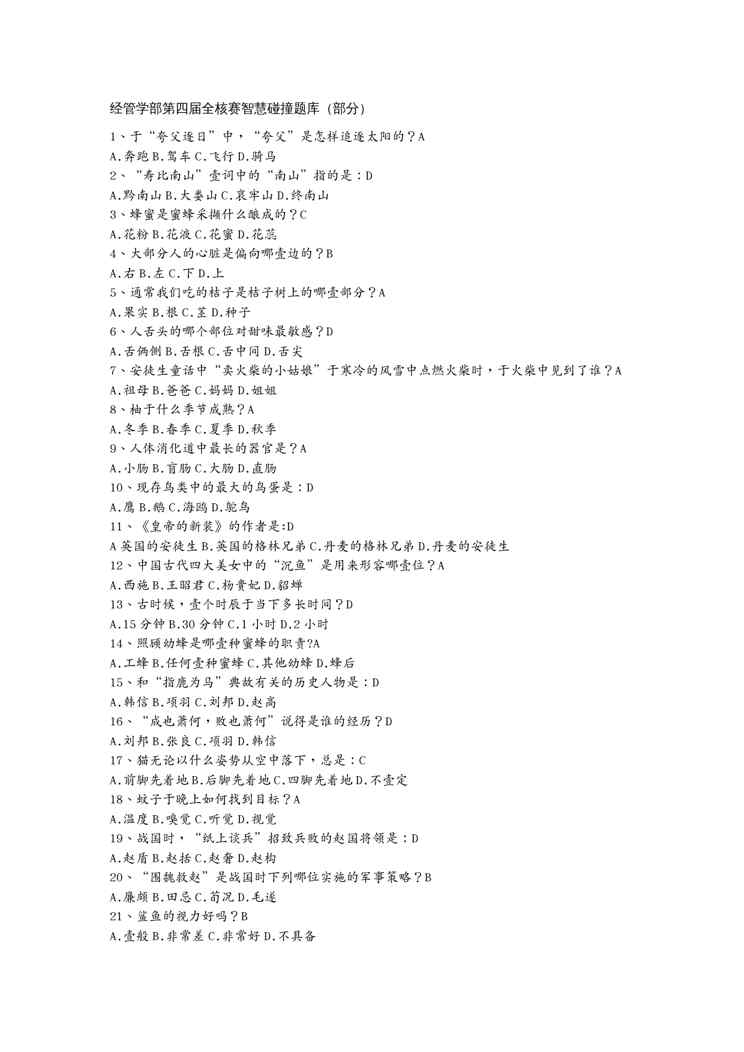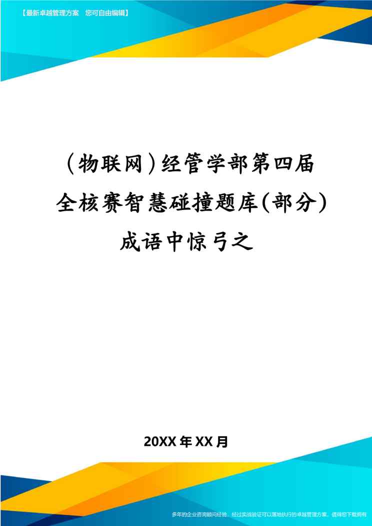 本站资深用户发布了最新的《(物联网)经管学部第四届全核赛智慧碰撞题库(部分)成语中惊弓之》文档,以下内容为预览,详细内容可下载阅读。 声明:本站所有文章,如无特殊说明或标注,均为本站原创发布。任何个人或组织,在未征得本站同意时,禁止复制、盗用、采集、发布本站内容到任何网站、书籍等各类媒体平台。如若本站内容侵犯了原著者的合法权益,可联系我们进行处理。
