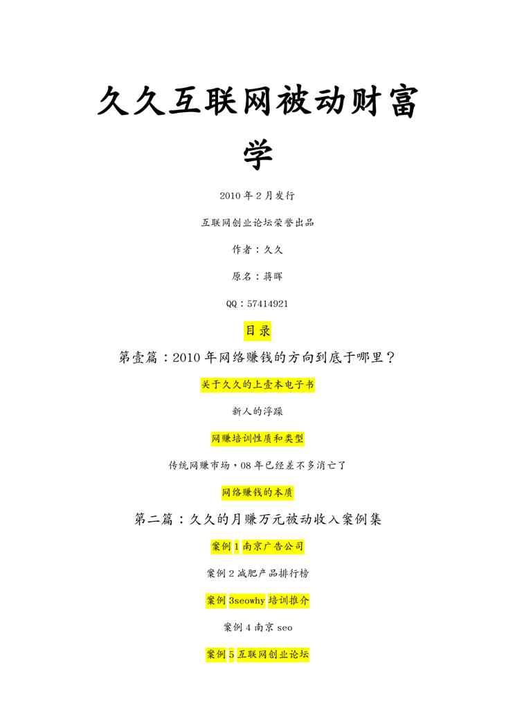 本站资深用户发布了最新的《(物联网)久久互联网被动财富学》文档,以下内容为预览,详细内容可下载阅读。 声明:本站所有文章,如无特殊说明或标注,均为本站原创发布。任何个人或组织,在未征得本站同意时,禁止复制、盗用、采集、发布本站内容到任何网站、书籍等各类媒体平台。如若本站内容侵犯了原著者的合法权益,可联系我们进行处理。