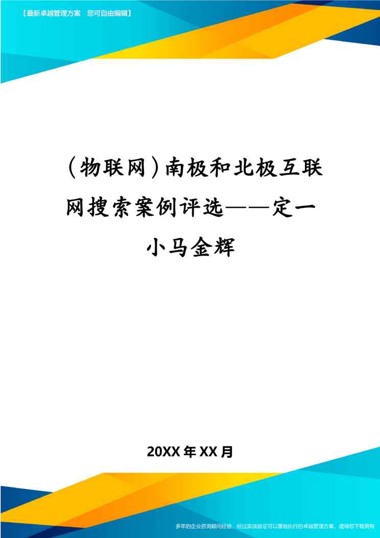 本站正式发布了《(物联网)南极和北极互联网搜索案例评选——定一小马金辉》文档,文档详细内容可下载阅读。 声明:本站所有文章,如无特殊说明或标注,均为本站原创发布。任何个人或组织,在未征得本站同意时,禁止复制、盗用、采集、发布本站内容到任何网站、书籍等各类媒体平台。如若本站内容侵犯了原著者的合法权益,可联系我们进行处理。