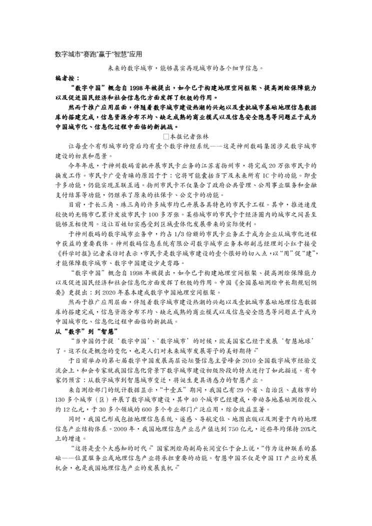 不久前,最新文档《(物联网)数字城市赛跑赢在智慧应用》全文正式在本站发布,感兴趣的用户可以下载阅读。 声明:本站所有文章,如无特殊说明或标注,均为本站原创发布。任何个人或组织,在未征得本站同意时,禁止复制、盗用、采集、发布本站内容到任何网站、书籍等各类媒体平台。如若本站内容侵犯了原著者的合法权益,可联系我们进行处理。