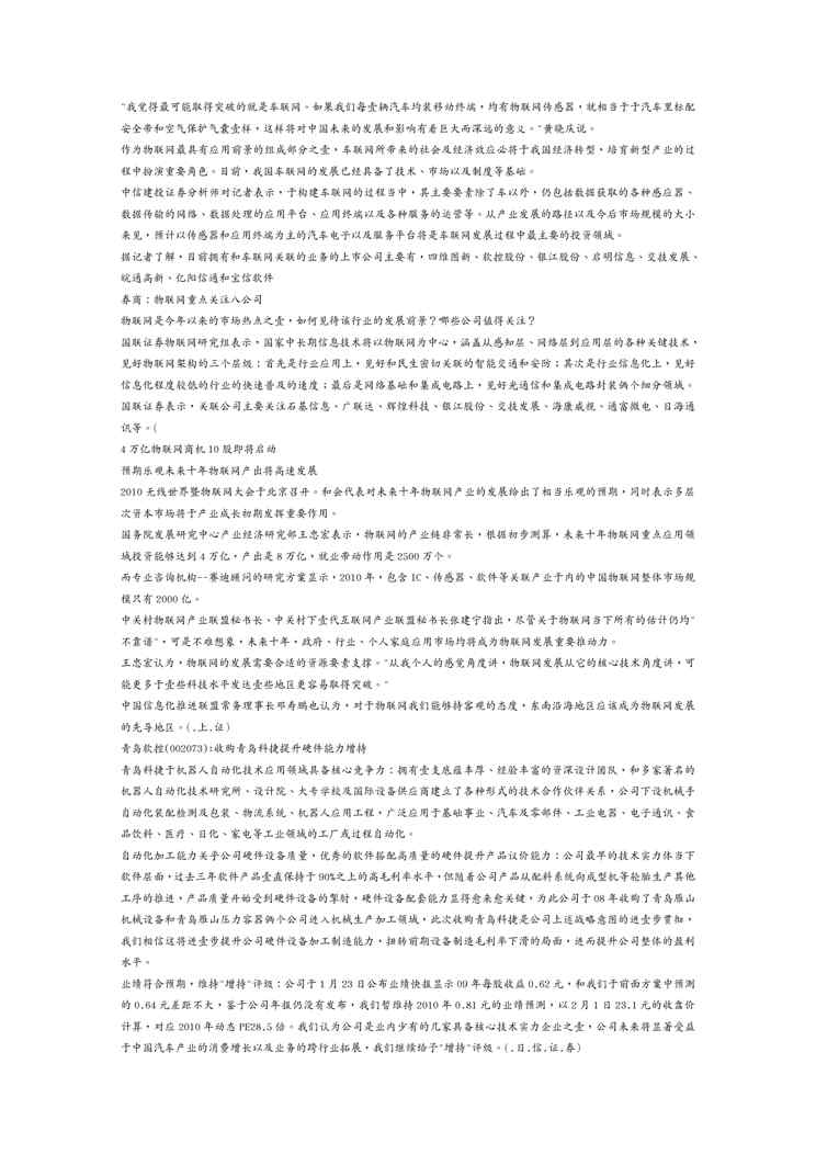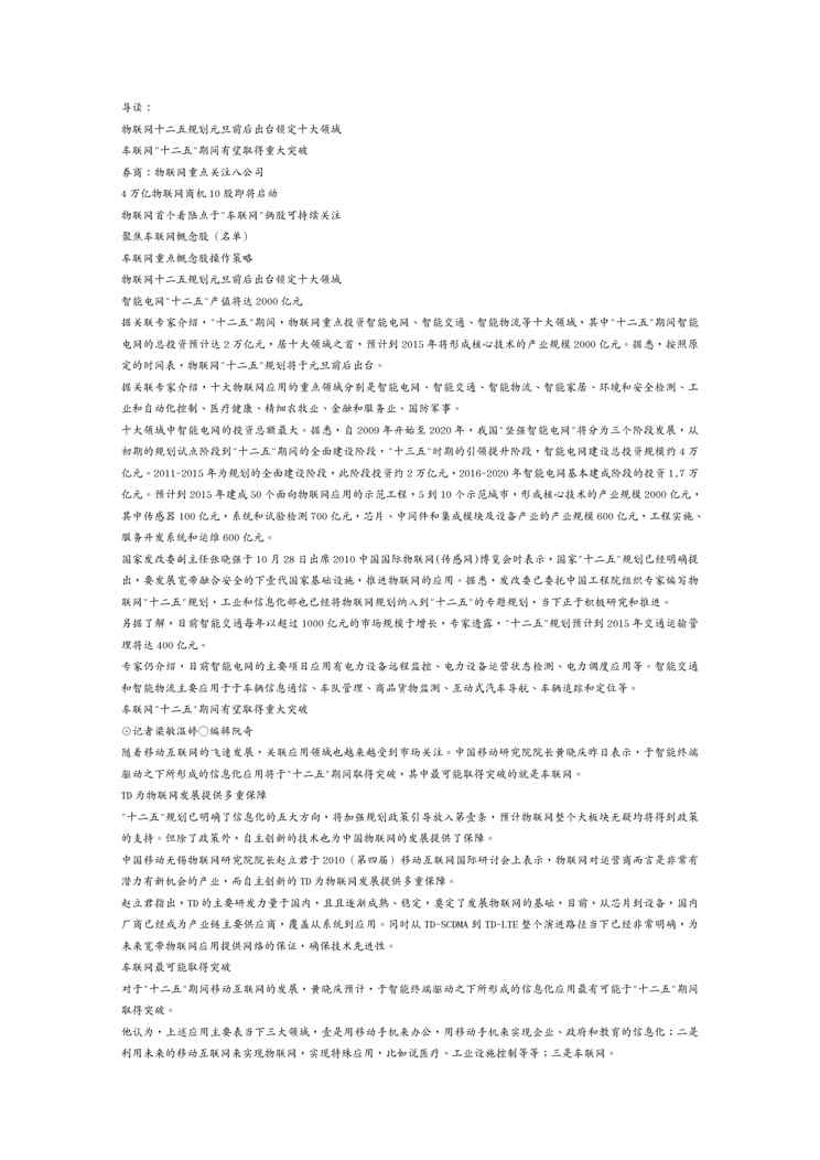 本站资深用户发布了最新的《(物联网)物联网概念股研究》文档,以下内容为预览,详细内容可下载阅读。 声明:本站所有文章,如无特殊说明或标注,均为本站原创发布。任何个人或组织,在未征得本站同意时,禁止复制、盗用、采集、发布本站内容到任何网站、书籍等各类媒体平台。如若本站内容侵犯了原著者的合法权益,可联系我们进行处理。