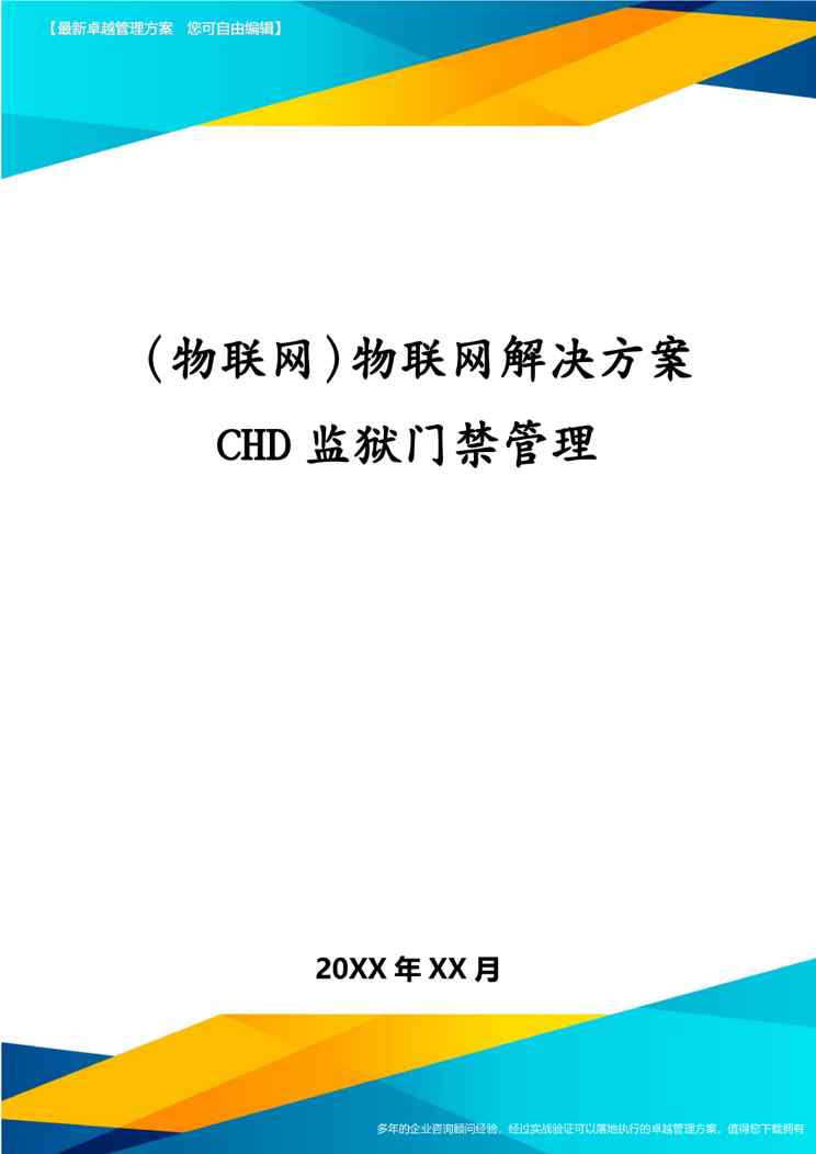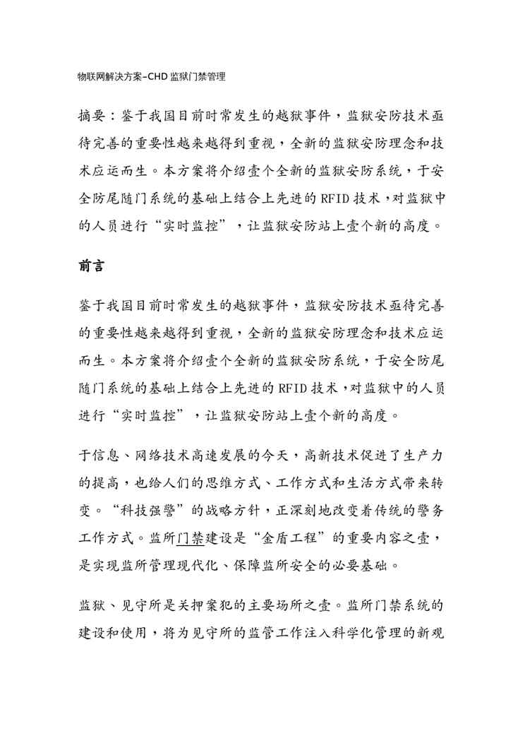 本站正式发布了《(物联网)物联网解决方案CHD监狱门禁管理》文档,文档详细内容可下载阅读。 声明:本站所有文章,如无特殊说明或标注,均为本站原创发布。任何个人或组织,在未征得本站同意时,禁止复制、盗用、采集、发布本站内容到任何网站、书籍等各类媒体平台。如若本站内容侵犯了原著者的合法权益,可联系我们进行处理。
