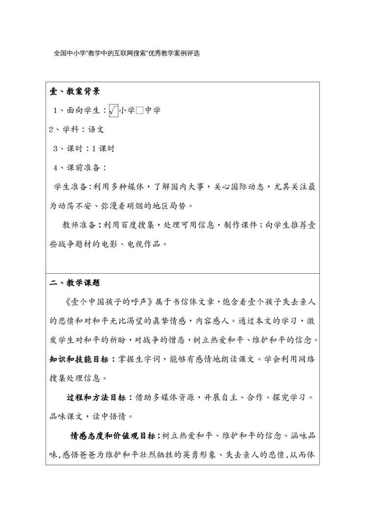 本站正式发布了《(物联网)一个中国孩子的呼声教学中的互联网搜索优秀教学案例》文档,文档详细内容可下载阅读。 声明:本站所有文章,如无特殊说明或标注,均为本站原创发布。任何个人或组织,在未征得本站同意时,禁止复制、盗用、采集、发布本站内容到任何网站、书籍等各类媒体平台。如若本站内容侵犯了原著者的合法权益,可联系我们进行处理。