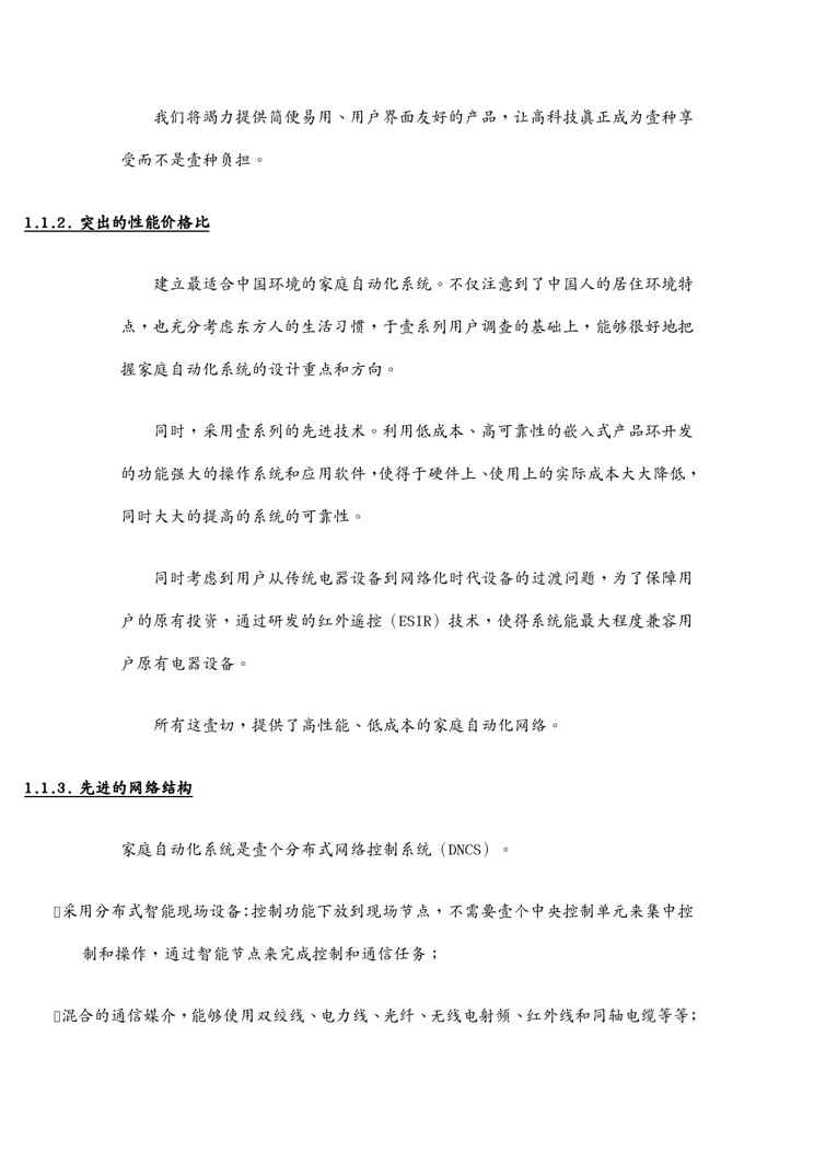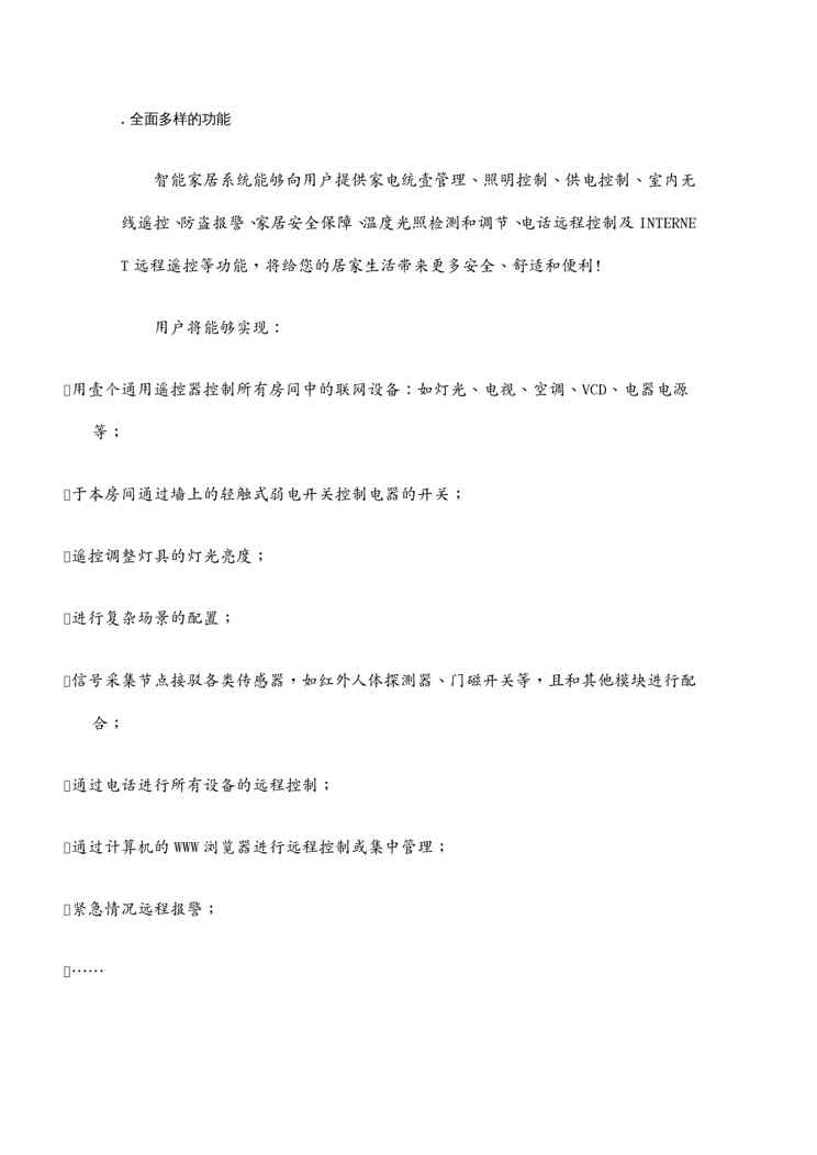 本站资深用户发布了最新的《(物联网)智能家居全面多样的功能》文档,以下内容为预览,详细内容可下载阅读。 声明:本站所有文章,如无特殊说明或标注,均为本站原创发布。任何个人或组织,在未征得本站同意时,禁止复制、盗用、采集、发布本站内容到任何网站、书籍等各类媒体平台。如若本站内容侵犯了原著者的合法权益,可联系我们进行处理。