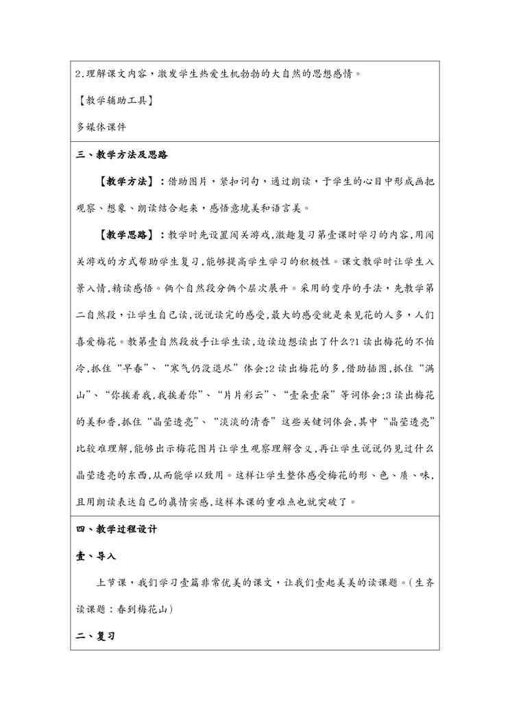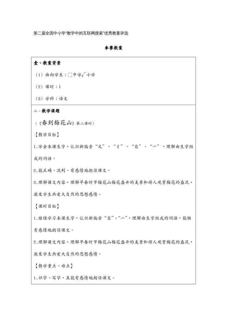 本站资深用户发布了最新的《(物联网)中小学教学中的互联网搜索优秀教案评选参赛教案春到梅花山》文档,以下内容为预览,详细内容可下载阅读。 声明:本站所有文章,如无特殊说明或标注,均为本站原创发布。任何个人或组织,在未征得本站同意时,禁止复制、盗用、采集、发布本站内容到任何网站、书籍等各类媒体平台。如若本站内容侵犯了原著者的合法权益,可联系我们进行处理。
