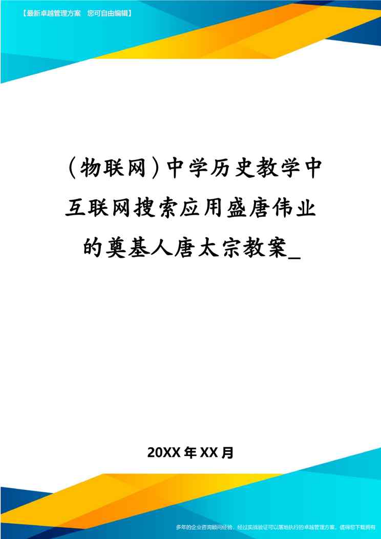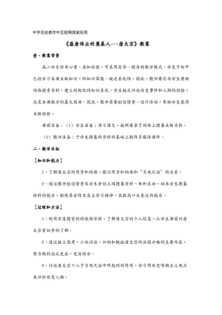 本站正式发布了《(物联网)中学历史教学中互联网搜索应用盛唐伟业的奠基人唐太宗教案_》文档,文档详细内容可下载阅读。 声明:本站所有文章,如无特殊说明或标注,均为本站原创发布。任何个人或组织,在未征得本站同意时,禁止复制、盗用、采集、发布本站内容到任何网站、书籍等各类媒体平台。如若本站内容侵犯了原著者的合法权益,可联系我们进行处理。