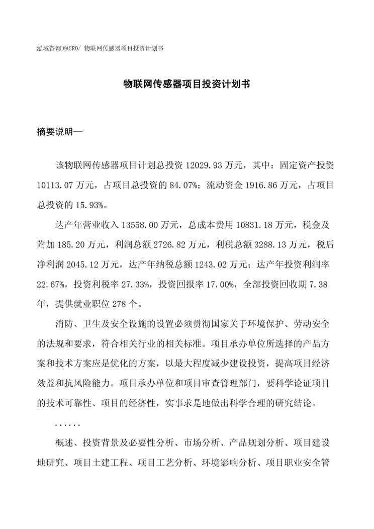 本站资深用户发布了最新的《(项目说明)物联网传感器项目投资计划书》文档,以下内容为预览,详细内容可下载阅读。 声明:本站所有文章,如无特殊说明或标注,均为本站原创发布。任何个人或组织,在未征得本站同意时,禁止复制、盗用、采集、发布本站内容到任何网站、书籍等各类媒体平台。如若本站内容侵犯了原著者的合法权益,可联系我们进行处理。