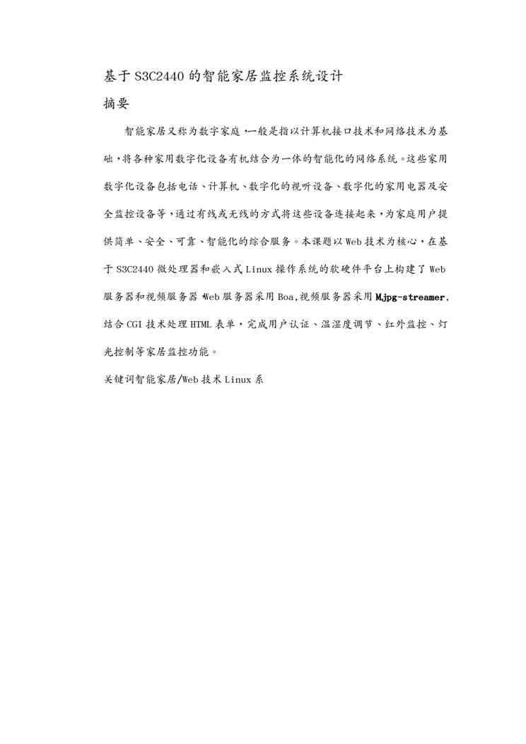 不久前,最新文档《{管理信息化物联网}基于S3C2440的智能家居监控系统设计》全文正式在本站发布,感兴趣的用户可以下载阅读。 声明:本站所有文章,如无特殊说明或标注,均为本站原创发布。任何个人或组织,在未征得本站同意时,禁止复制、盗用、采集、发布本站内容到任何网站、书籍等各类媒体平台。如若本站内容侵犯了原著者的合法权益,可联系我们进行处理。