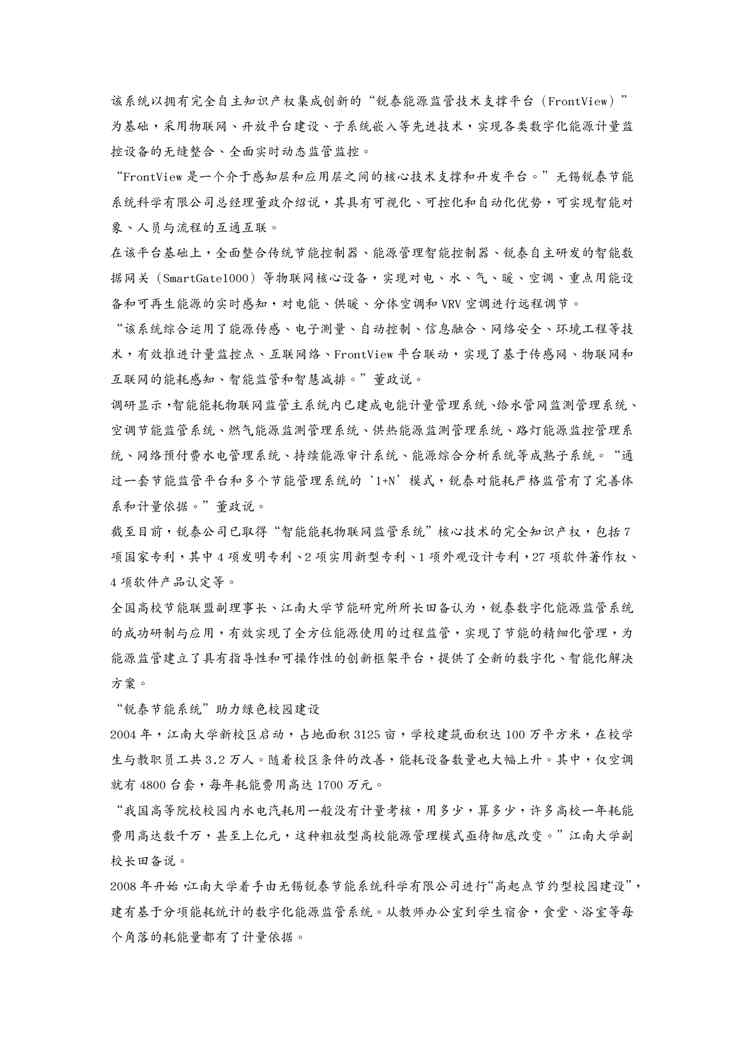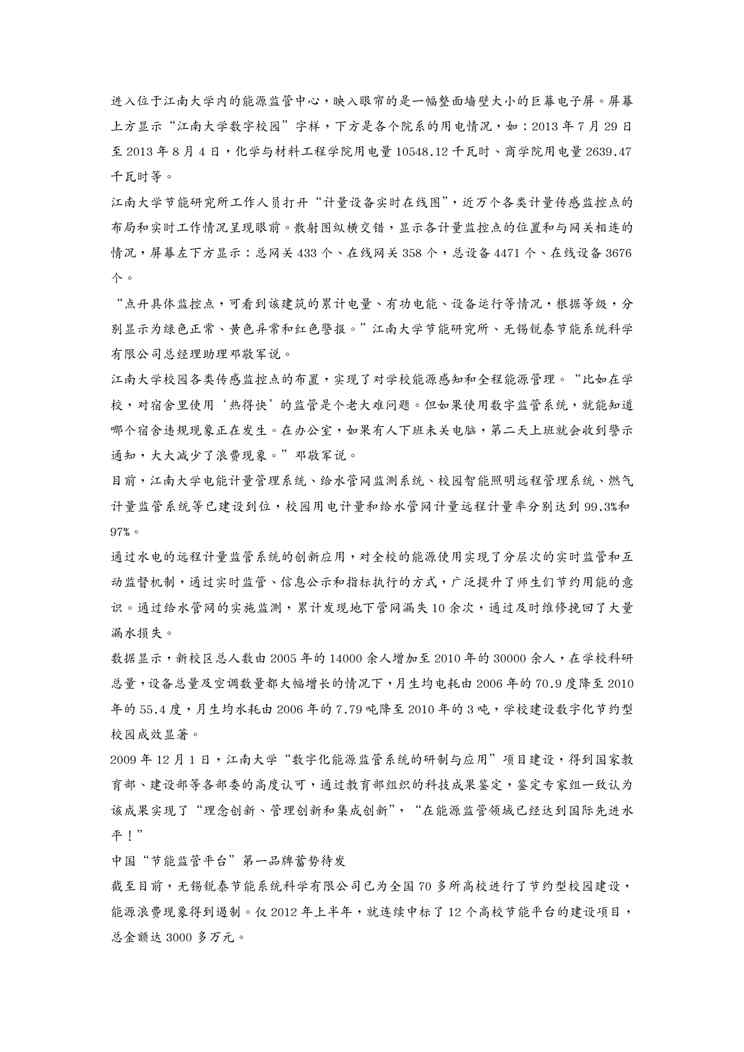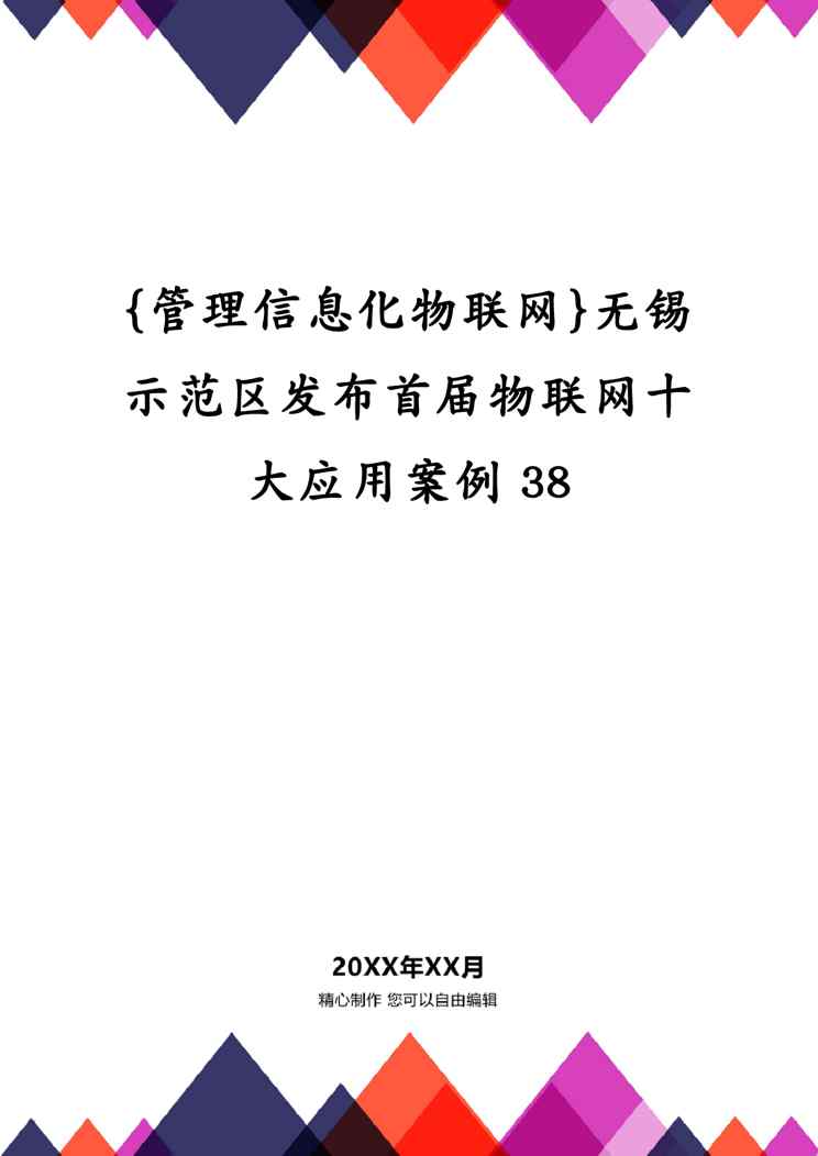 本站资深用户发布了最新的《{管理信息化物联网}无锡示范区发布首届物联网十大应用案例38》文档,以下内容为预览,详细内容可下载阅读。 声明:本站所有文章,如无特殊说明或标注,均为本站原创发布。任何个人或组织,在未征得本站同意时,禁止复制、盗用、采集、发布本站内容到任何网站、书籍等各类媒体平台。如若本站内容侵犯了原著者的合法权益,可联系我们进行处理。