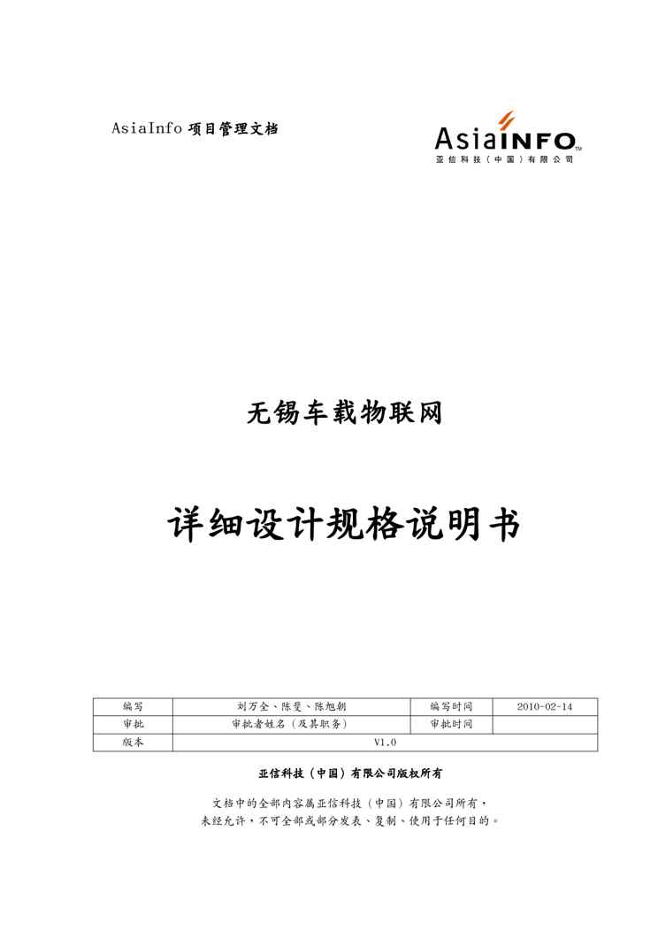 不久前,最新文档《(项目管理)无锡车载物联网项目详细设计规格说明书》全文正式在本站发布,感兴趣的用户可以下载阅读。 声明:本站所有文章,如无特殊说明或标注,均为本站原创发布。任何个人或组织,在未征得本站同意时,禁止复制、盗用、采集、发布本站内容到任何网站、书籍等各类媒体平台。如若本站内容侵犯了原著者的合法权益,可联系我们进行处理。
