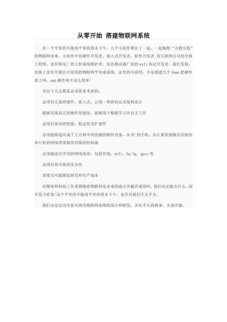 本站资深用户发布了最新的《从零开始 搭建物联网系统》文档,以下内容为预览,详细内容可下载阅读。 声明:本站所有文章,如无特殊说明或标注,均为本站原创发布。任何个人或组织,在未征得本站同意时,禁止复制、盗用、采集、发布本站内容到任何网站、书籍等各类媒体平台。如若本站内容侵犯了原著者的合法权益,可联系我们进行处理。