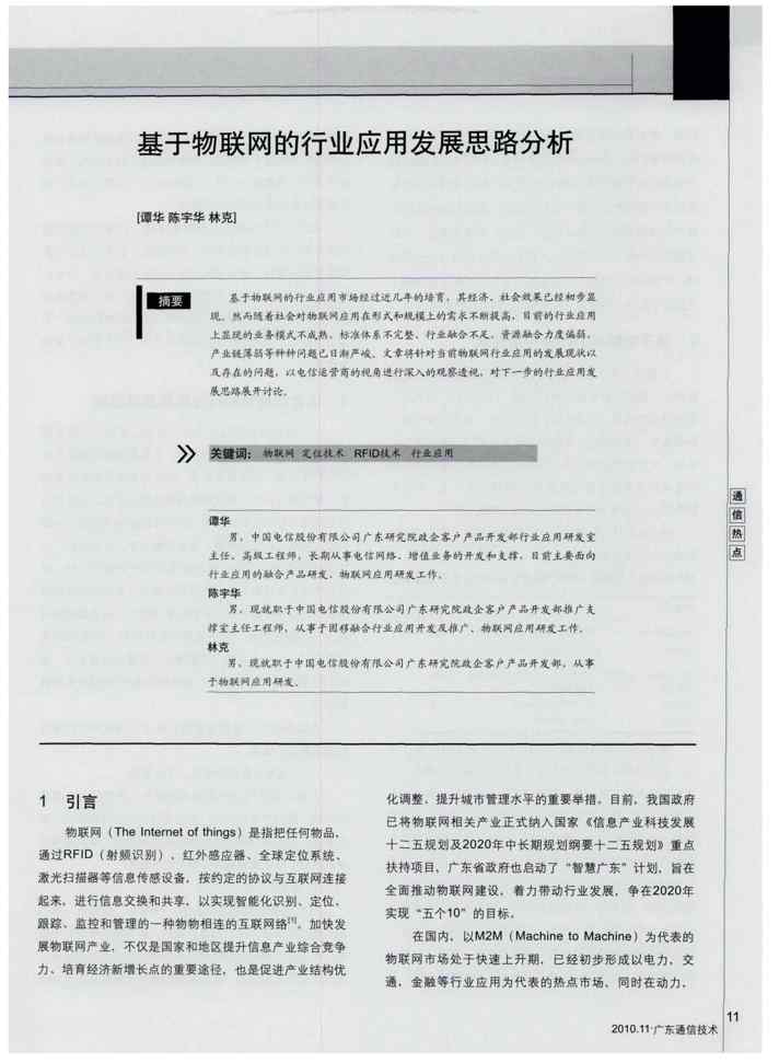 本站资深用户发布了最新的《基于物联网的行业应用发展思路分析》文档,以下内容为预览,详细内容可下载阅读。 声明:本站所有文章,如无特殊说明或标注,均为本站原创发布。任何个人或组织,在未征得本站同意时,禁止复制、盗用、采集、发布本站内容到任何网站、书籍等各类媒体平台。如若本站内容侵犯了原著者的合法权益,可联系我们进行处理。