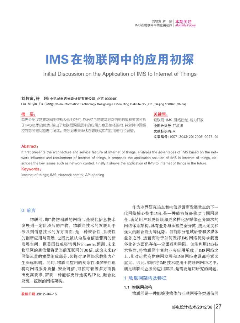 不久前,最新文档《IMS在物联网中的应用初探》全文正式在本站发布,感兴趣的用户可以下载阅读。 声明:本站所有文章,如无特殊说明或标注,均为本站原创发布。任何个人或组织,在未征得本站同意时,禁止复制、盗用、采集、发布本站内容到任何网站、书籍等各类媒体平台。如若本站内容侵犯了原著者的合法权益,可联系我们进行处理。