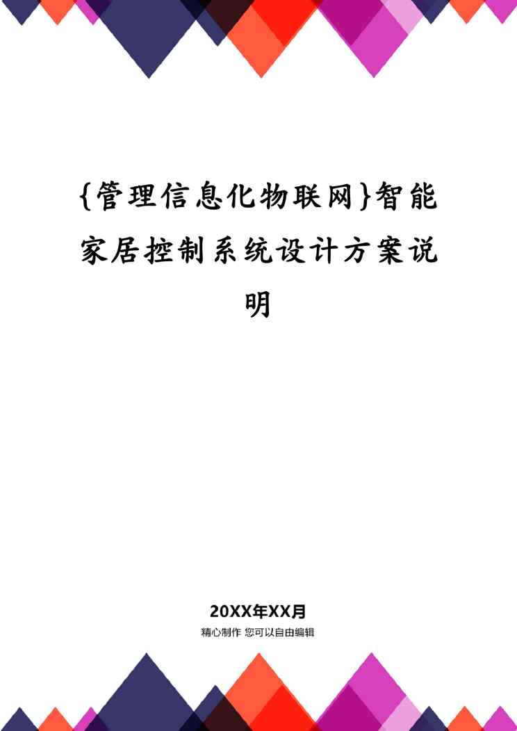 本站正式发布了《{管理信息化物联网}智能家居控制系统设计方案说明》文档,文档详细内容可下载阅读。 声明:本站所有文章,如无特殊说明或标注,均为本站原创发布。任何个人或组织,在未征得本站同意时,禁止复制、盗用、采集、发布本站内容到任何网站、书籍等各类媒体平台。如若本站内容侵犯了原著者的合法权益,可联系我们进行处理。