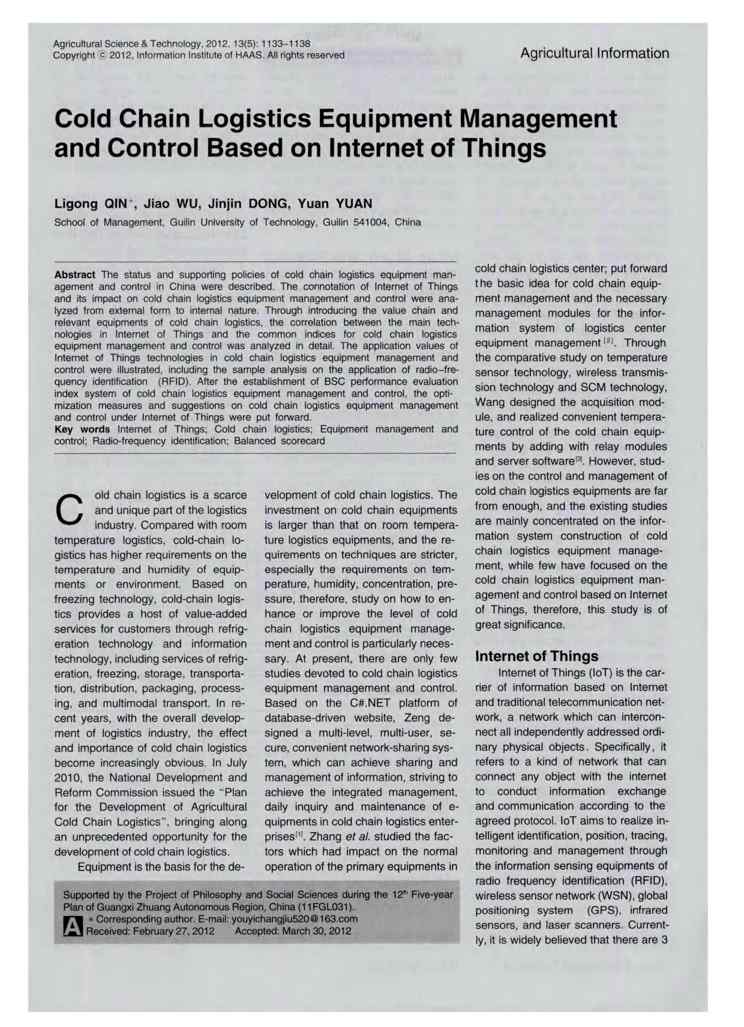 本站正式发布了《基于物联网的冷链物流设备管控研究》文档,文档详细内容可下载阅读。 声明:本站所有文章,如无特殊说明或标注,均为本站原创发布。任何个人或组织,在未征得本站同意时,禁止复制、盗用、采集、发布本站内容到任何网站、书籍等各类媒体平台。如若本站内容侵犯了原著者的合法权益,可联系我们进行处理。