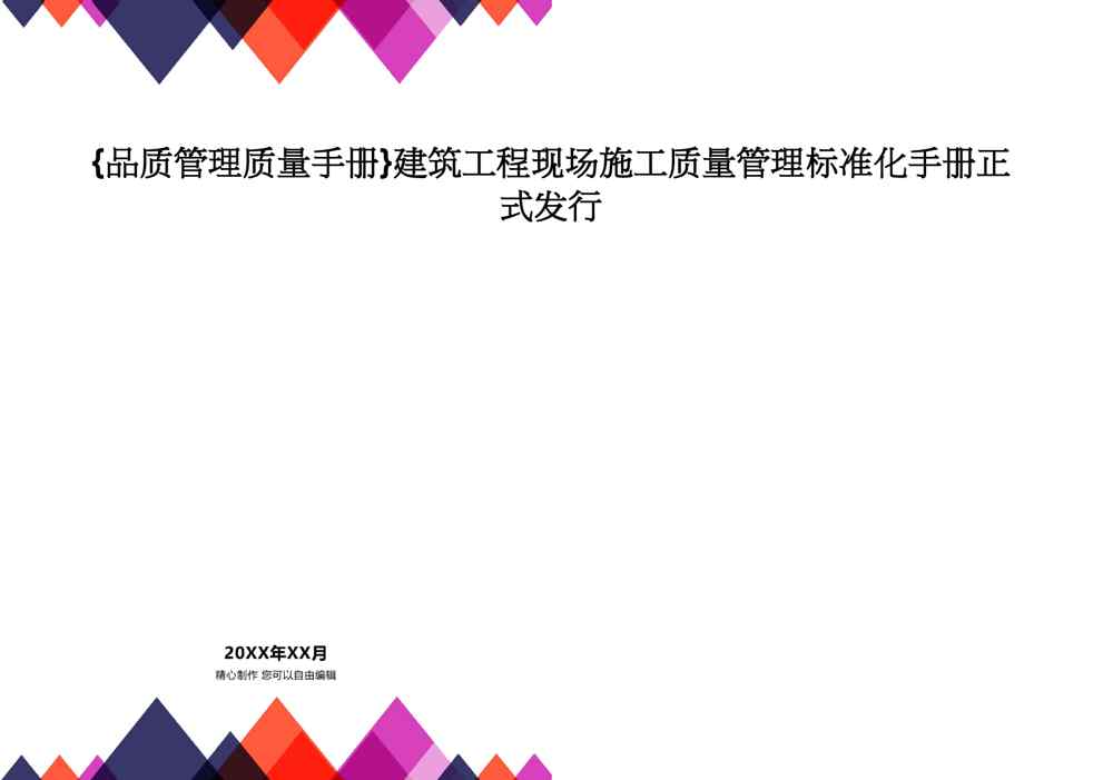 本站资深用户发布了最新的《{品质管理质量手册}建筑工程现场施工质量管理标准化手册正式发行》文档,以下内容为预览,详细内容可下载阅读。 声明:本站所有文章,如无特殊说明或标注,均为本站原创发布。任何个人或组织,在未征得本站同意时,禁止复制、盗用、采集、发布本站内容到任何网站、书籍等各类媒体平台。如若本站内容侵犯了原著者的合法权益,可联系我们进行处理。