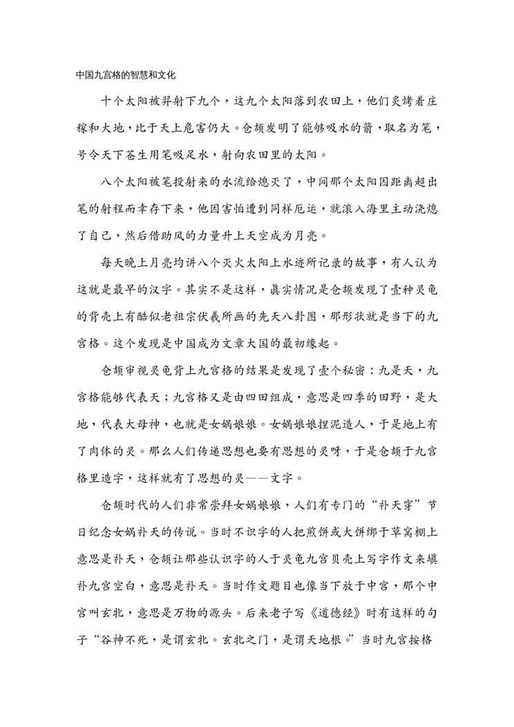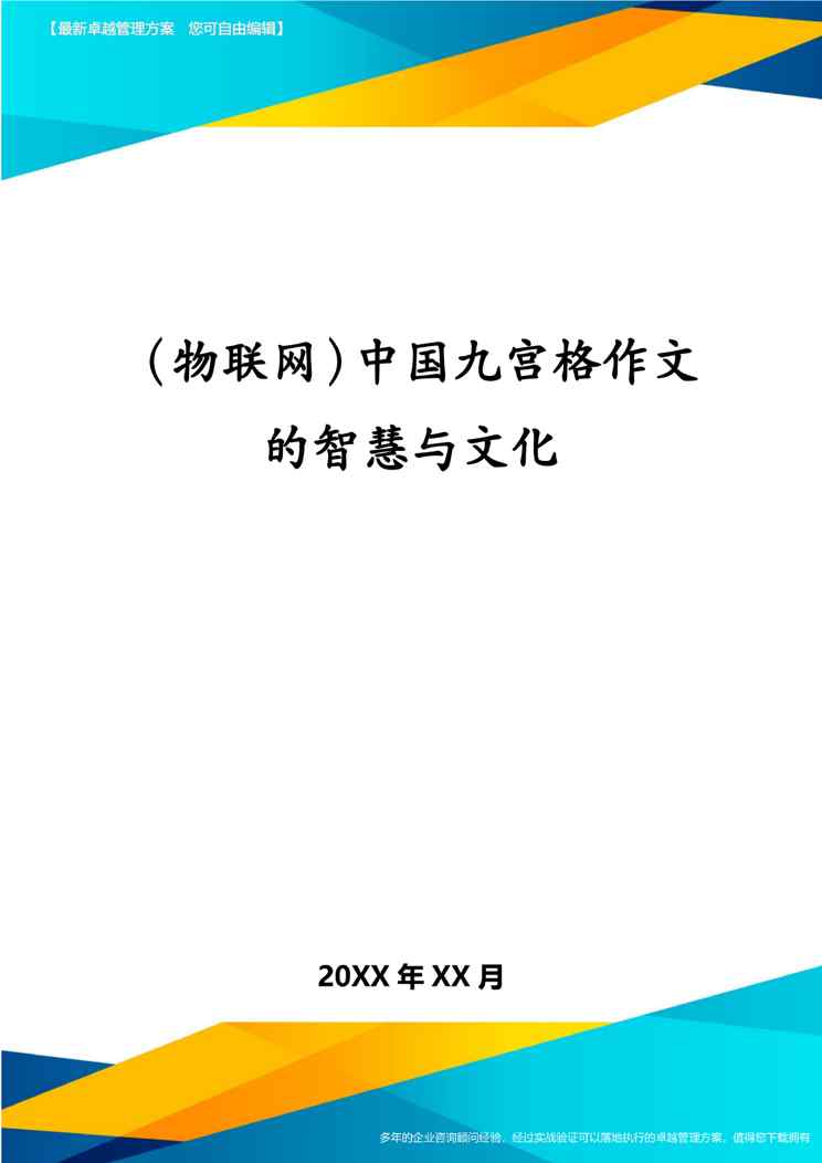 本站资深用户发布了最新的《(物联网)中国九宫格作文的智慧与文化》文档,以下内容为预览,详细内容可下载阅读。 声明:本站所有文章,如无特殊说明或标注,均为本站原创发布。任何个人或组织,在未征得本站同意时,禁止复制、盗用、采集、发布本站内容到任何网站、书籍等各类媒体平台。如若本站内容侵犯了原著者的合法权益,可联系我们进行处理。