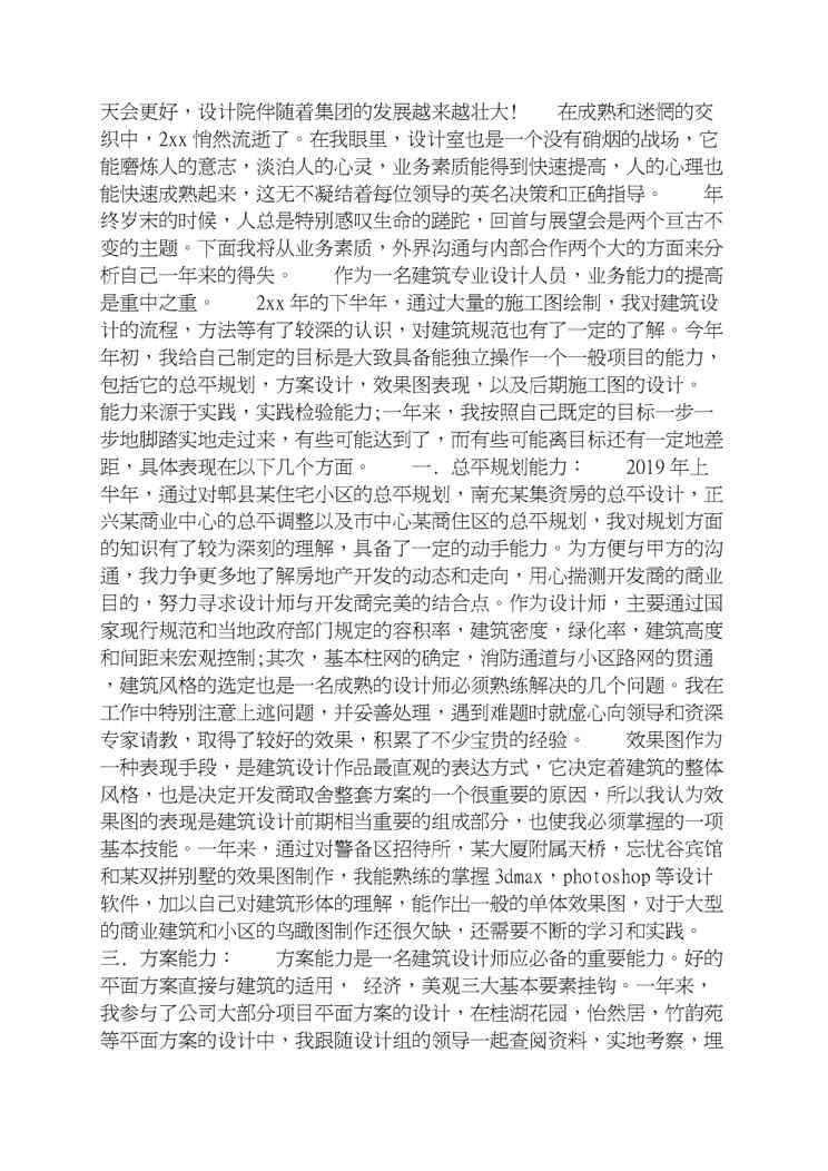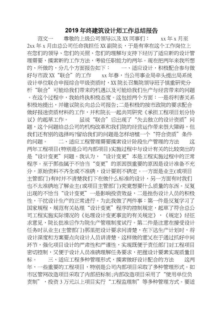 本站正式发布了《2019年终建筑设计师工作总结报告》文档,文档详细内容可下载阅读。 声明:本站所有文章,如无特殊说明或标注,均为本站原创发布。任何个人或组织,在未征得本站同意时,禁止复制、盗用、采集、发布本站内容到任何网站、书籍等各类媒体平台。如若本站内容侵犯了原著者的合法权益,可联系我们进行处理。