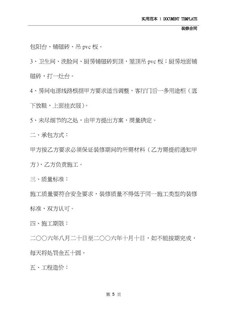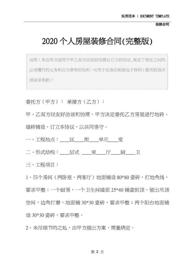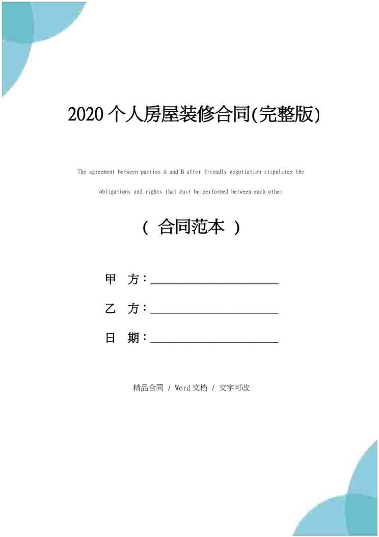 本站资深用户发布了最新的《2020个人房屋装修合同(完整版)》文档,以下内容为预览,详细内容可下载阅读。 声明:本站所有文章,如无特殊说明或标注,均为本站原创发布。任何个人或组织,在未征得本站同意时,禁止复制、盗用、采集、发布本站内容到任何网站、书籍等各类媒体平台。如若本站内容侵犯了原著者的合法权益,可联系我们进行处理。