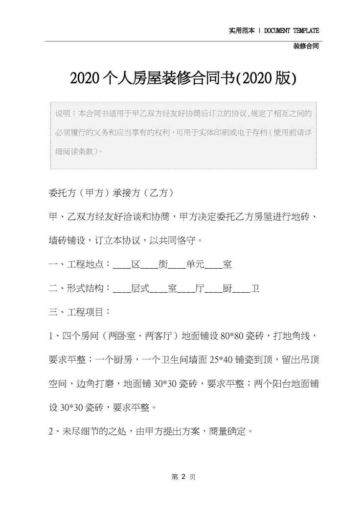 本站正式发布了《2020个人房屋装修合同书(2020版)》文档,文档详细内容可下载阅读。 声明:本站所有文章,如无特殊说明或标注,均为本站原创发布。任何个人或组织,在未征得本站同意时,禁止复制、盗用、采集、发布本站内容到任何网站、书籍等各类媒体平台。如若本站内容侵犯了原著者的合法权益,可联系我们进行处理。