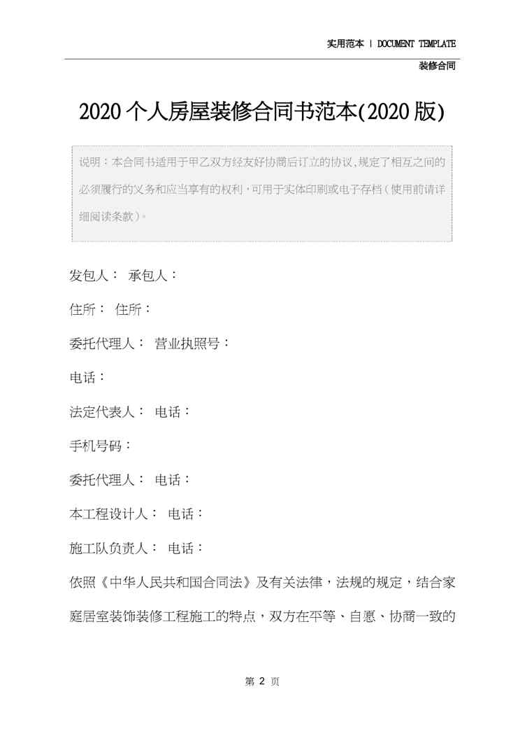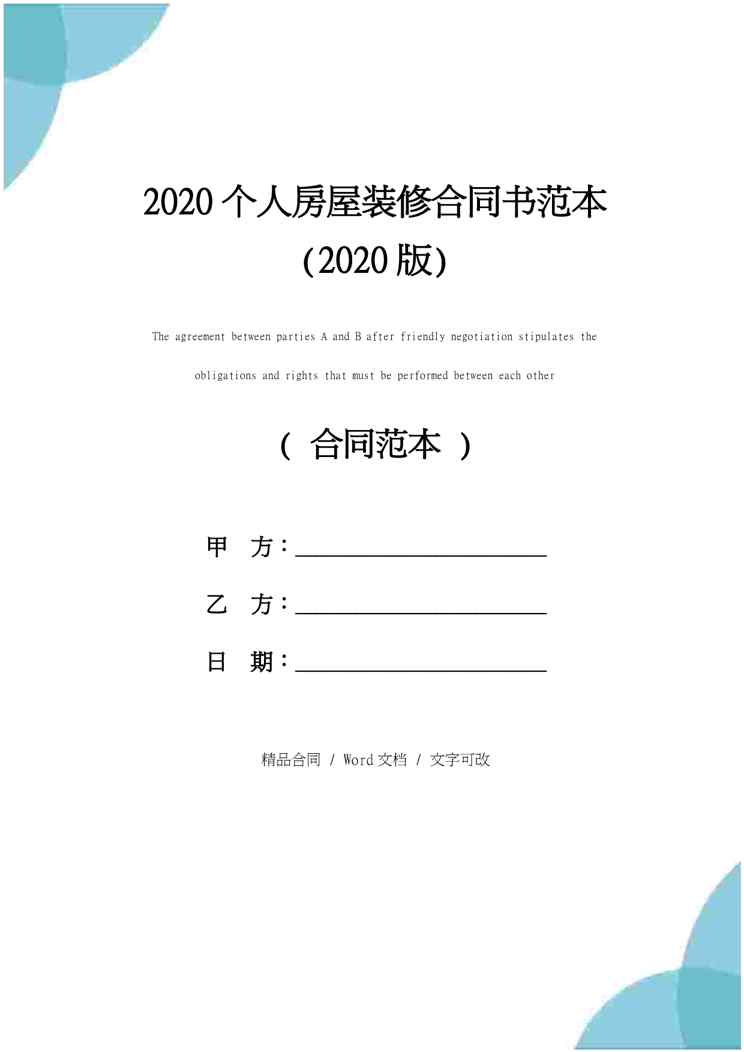 本站正式发布了《2020个人房屋装修合同书范本(2020版)》文档,文档详细内容可下载阅读。 声明:本站所有文章,如无特殊说明或标注,均为本站原创发布。任何个人或组织,在未征得本站同意时,禁止复制、盗用、采集、发布本站内容到任何网站、书籍等各类媒体平台。如若本站内容侵犯了原著者的合法权益,可联系我们进行处理。