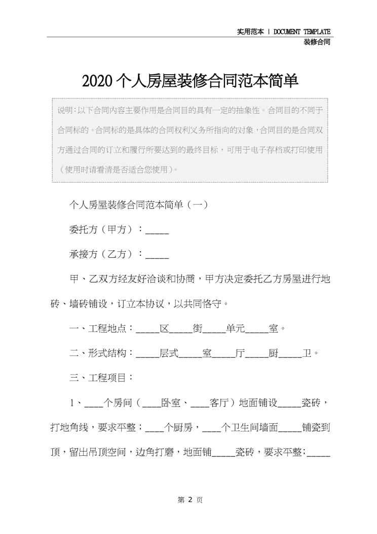 本站资深用户发布了最新的《2020个人房屋装修合同范本简单》文档,以下内容为预览,详细内容可下载阅读。