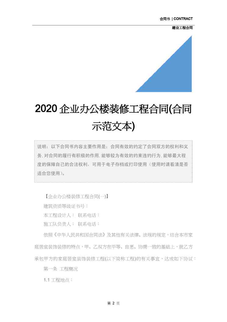 不久前,最新文档《2020企业办公楼装修工程合同(合同示范文本)》全文正式在本站发布,感兴趣的用户可以下载阅读。 声明:本站所有文章,如无特殊说明或标注,均为本站原创发布。任何个人或组织,在未征得本站同意时,禁止复制、盗用、采集、发布本站内容到任何网站、书籍等各类媒体平台。如若本站内容侵犯了原著者的合法权益,可联系我们进行处理。