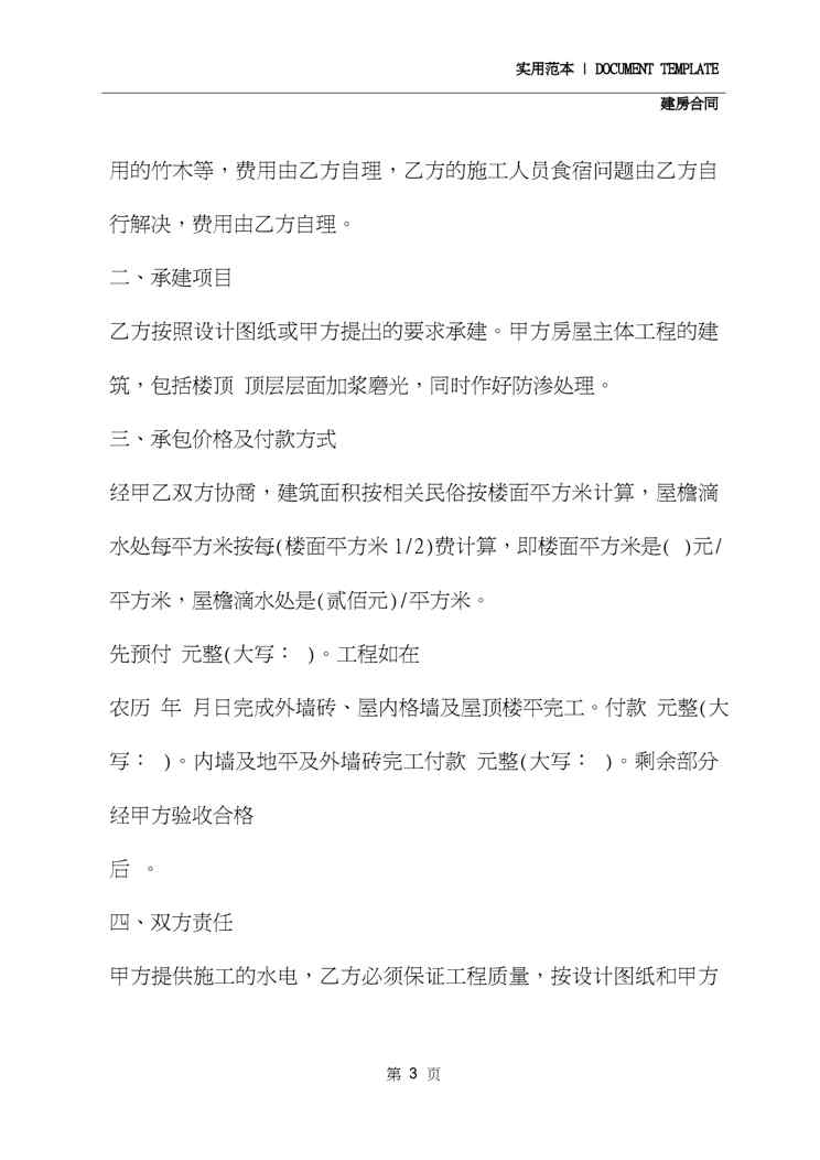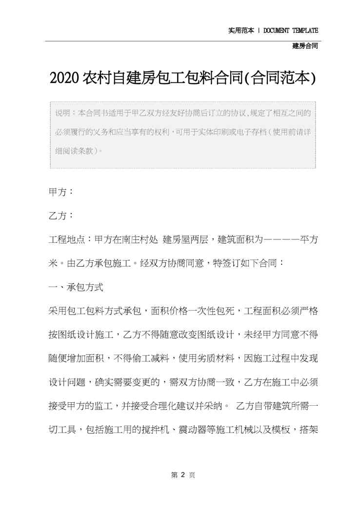 本站资深用户发布了最新的《2020农村自建房包工包料合同(合同范本)》文档,以下内容为预览,详细内容可下载阅读。 声明:本站所有文章,如无特殊说明或标注,均为本站原创发布。任何个人或组织,在未征得本站同意时,禁止复制、盗用、采集、发布本站内容到任何网站、书籍等各类媒体平台。如若本站内容侵犯了原著者的合法权益,可联系我们进行处理。