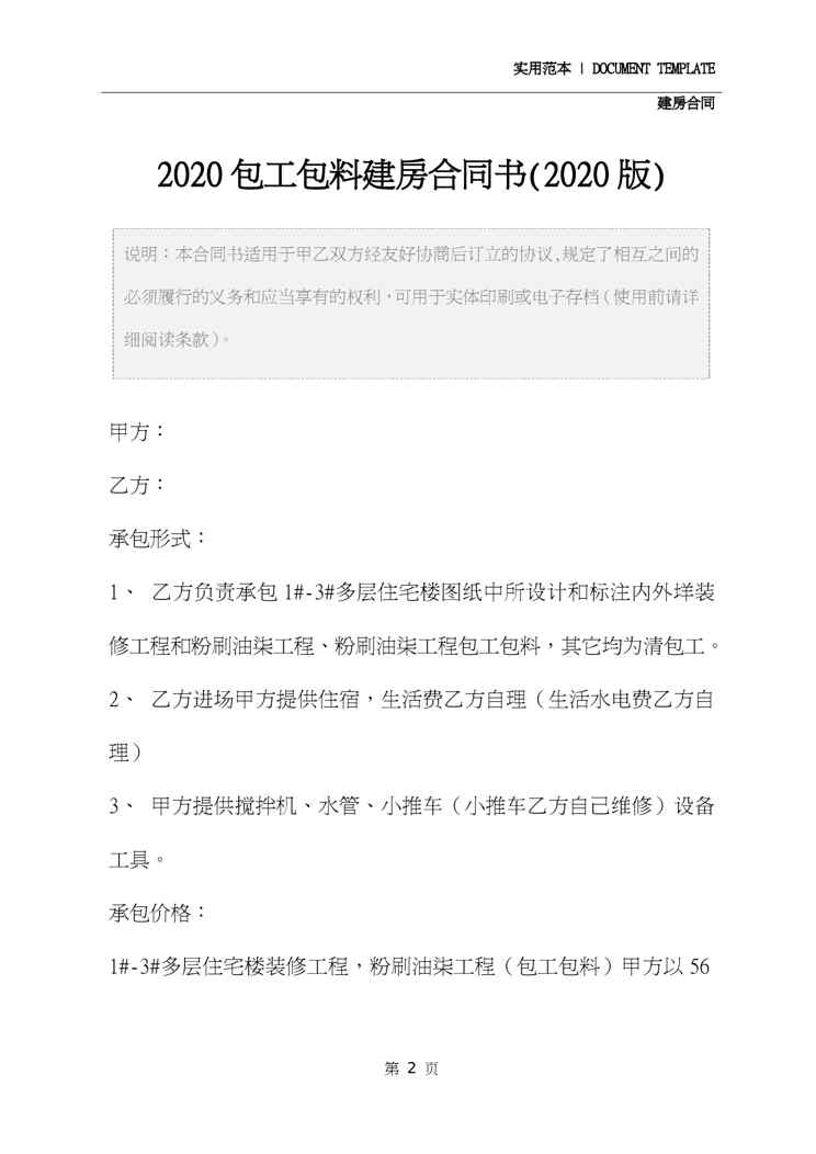本站正式发布了《2020包工包料建房合同书(2020版)》文档,文档详细内容可下载阅读。 声明:本站所有文章,如无特殊说明或标注,均为本站原创发布。任何个人或组织,在未征得本站同意时,禁止复制、盗用、采集、发布本站内容到任何网站、书籍等各类媒体平台。如若本站内容侵犯了原著者的合法权益,可联系我们进行处理。