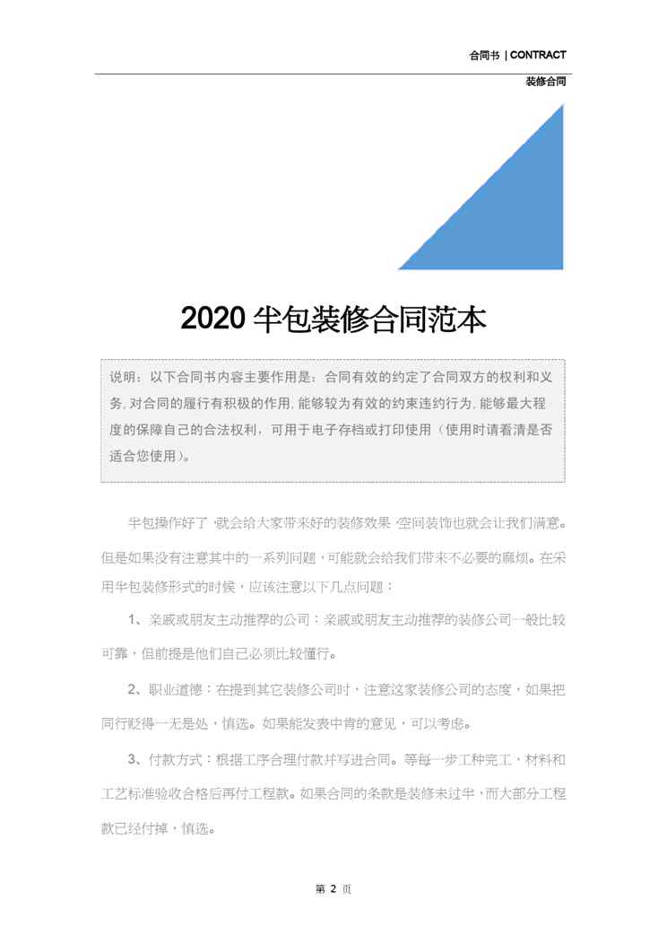 不久前,最新文档《2020半包装修合同范本》全文正式在本站发布,感兴趣的用户可以下载阅读。 声明:本站所有文章,如无特殊说明或标注,均为本站原创发布。任何个人或组织,在未征得本站同意时,禁止复制、盗用、采集、发布本站内容到任何网站、书籍等各类媒体平台。如若本站内容侵犯了原著者的合法权益,可联系我们进行处理。