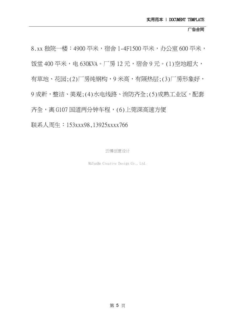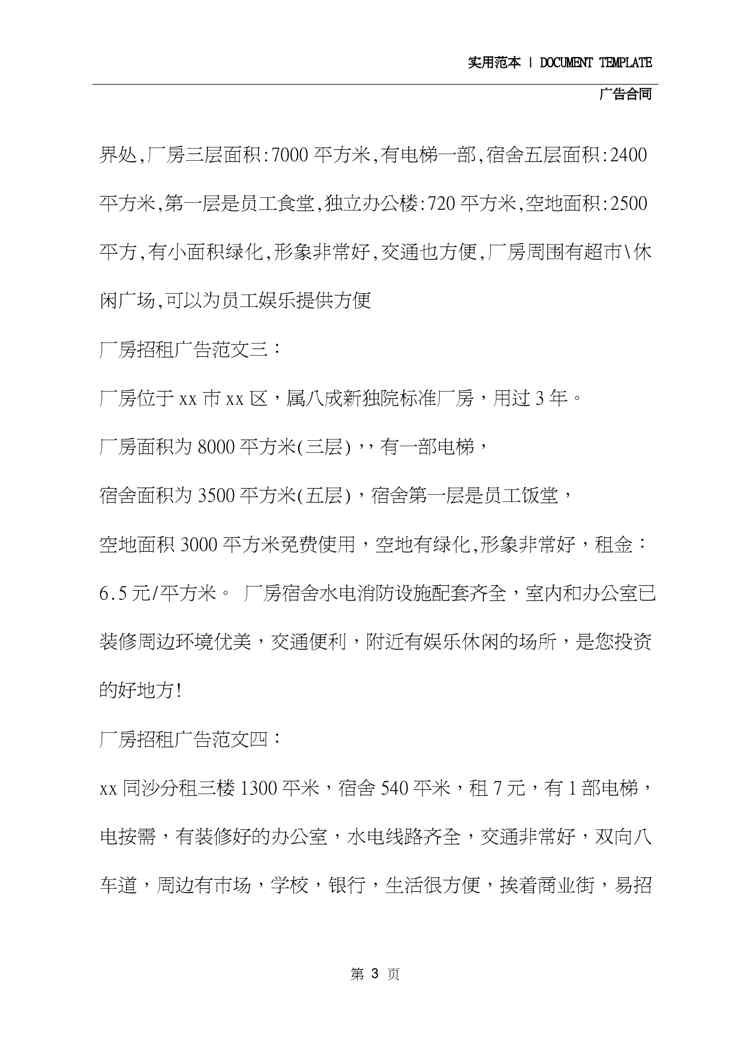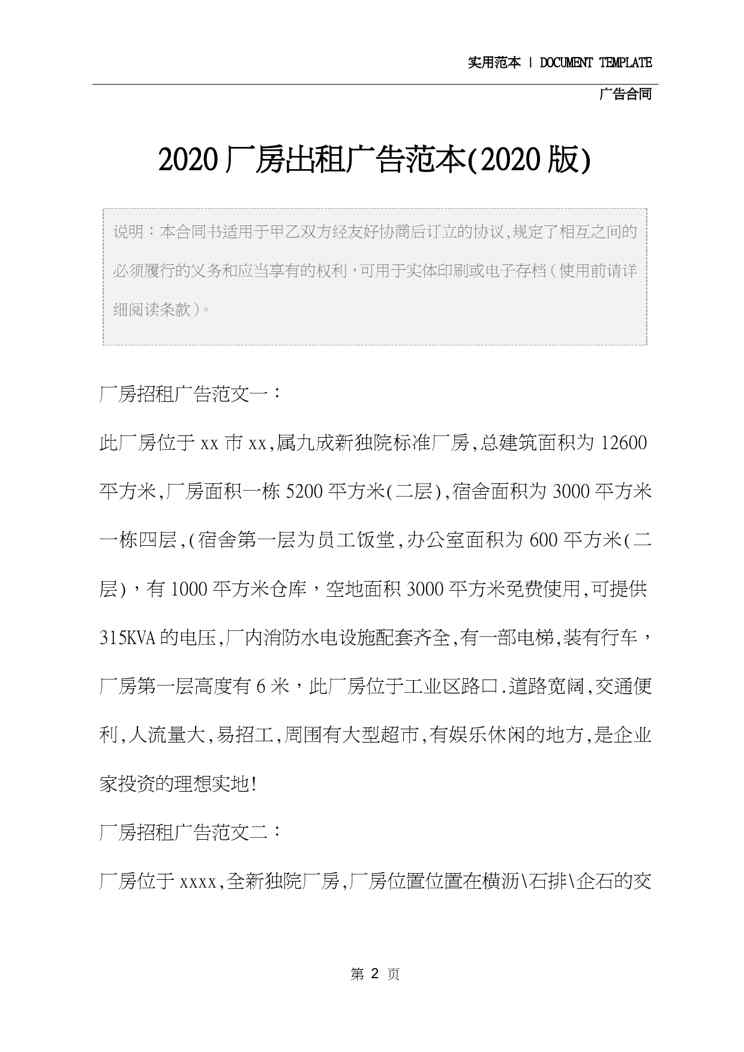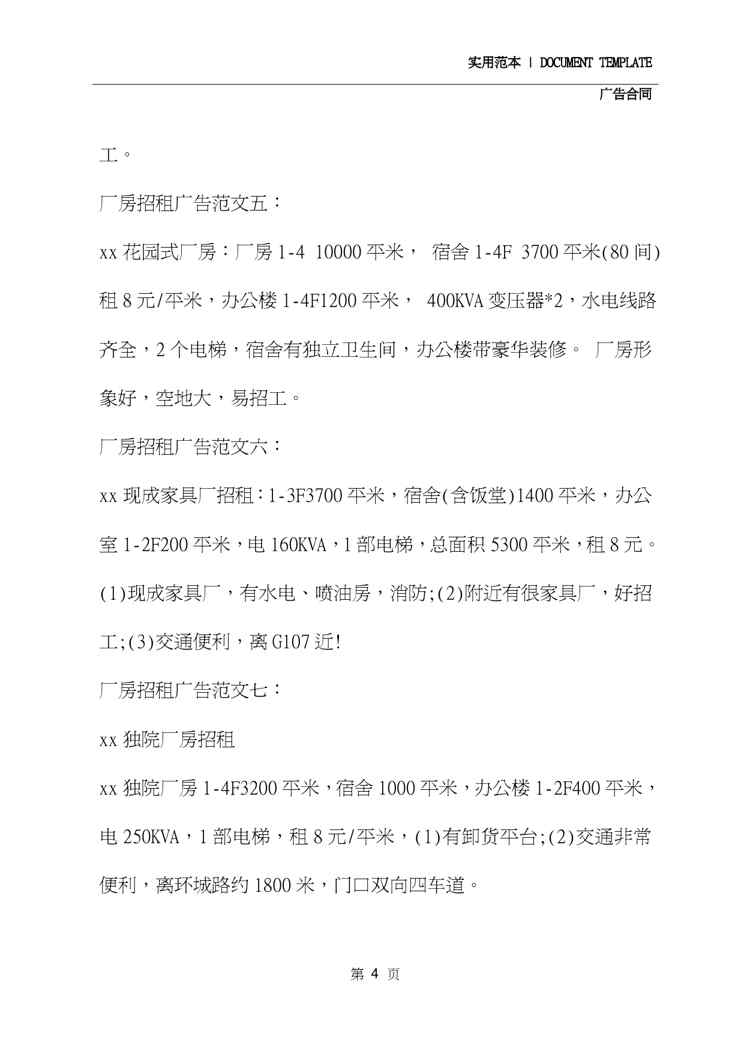 本站资深用户发布了最新的《2020厂房出租广告范本(2020版)》文档,以下内容为预览,详细内容可下载阅读。 声明:本站所有文章,如无特殊说明或标注,均为本站原创发布。任何个人或组织,在未征得本站同意时,禁止复制、盗用、采集、发布本站内容到任何网站、书籍等各类媒体平台。如若本站内容侵犯了原著者的合法权益,可联系我们进行处理。