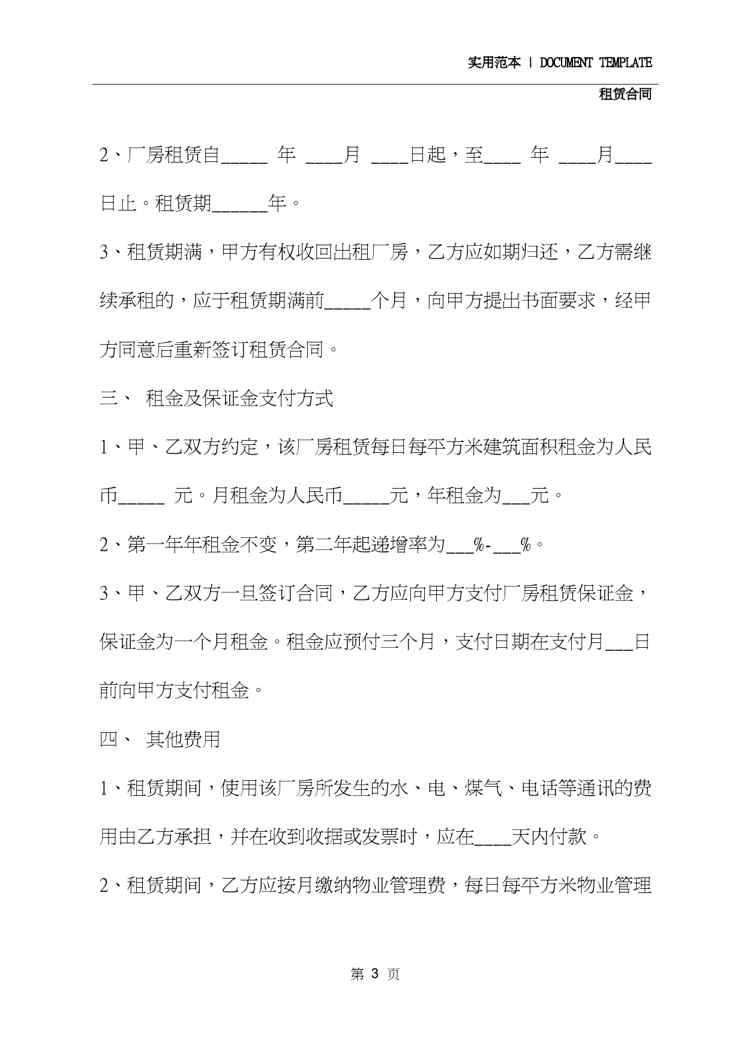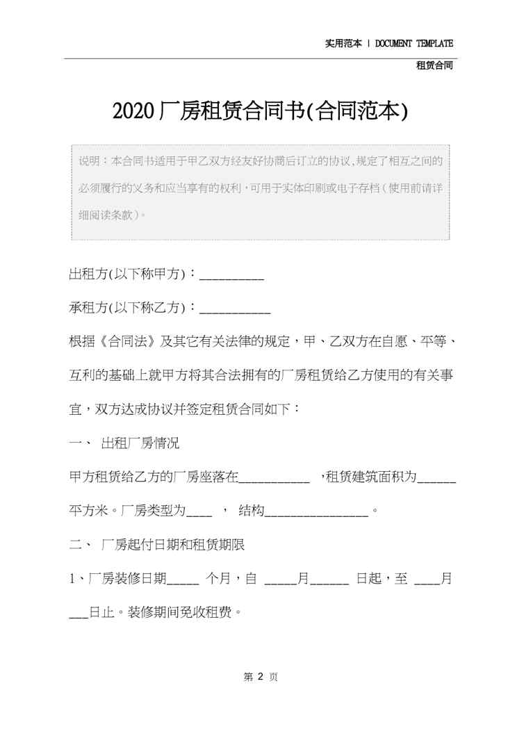本站正式发布了《2020厂房租赁合同书(合同范本)》文档,文档详细内容可下载阅读。 声明:本站所有文章,如无特殊说明或标注,均为本站原创发布。任何个人或组织,在未征得本站同意时,禁止复制、盗用、采集、发布本站内容到任何网站、书籍等各类媒体平台。如若本站内容侵犯了原著者的合法权益,可联系我们进行处理。