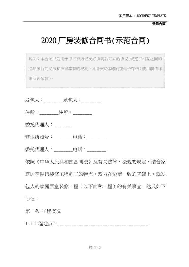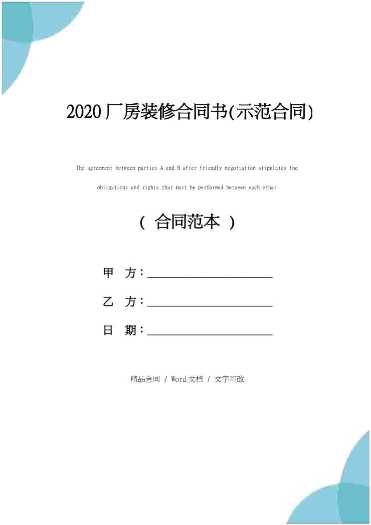 本站资深用户发布了最新的《2020厂房装修合同书(示范合同)》文档,以下内容为预览,详细内容可下载阅读。 声明:本站所有文章,如无特殊说明或标注,均为本站原创发布。任何个人或组织,在未征得本站同意时,禁止复制、盗用、采集、发布本站内容到任何网站、书籍等各类媒体平台。如若本站内容侵犯了原著者的合法权益,可联系我们进行处理。