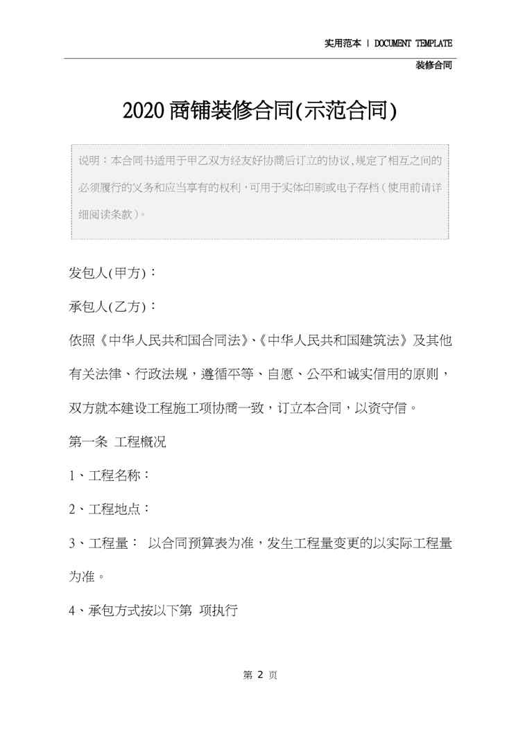 本站资深用户发布了最新的《2020商铺装修合同(示范合同)》文档,以下内容为预览,详细内容可下载阅读。 声明:本站所有文章,如无特殊说明或标注,均为本站原创发布。任何个人或组织,在未征得本站同意时,禁止复制、盗用、采集、发布本站内容到任何网站、书籍等各类媒体平台。如若本站内容侵犯了原著者的合法权益,可联系我们进行处理。