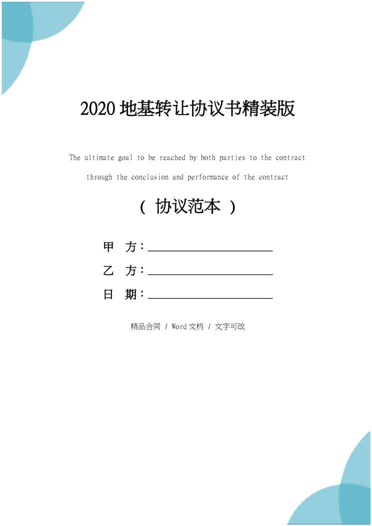 不久前,最新文档《2020地基转让协议书精装版》全文正式在本站发布,感兴趣的用户可以下载阅读。 声明:本站所有文章,如无特殊说明或标注,均为本站原创发布。任何个人或组织,在未征得本站同意时,禁止复制、盗用、采集、发布本站内容到任何网站、书籍等各类媒体平台。如若本站内容侵犯了原著者的合法权益,可联系我们进行处理。