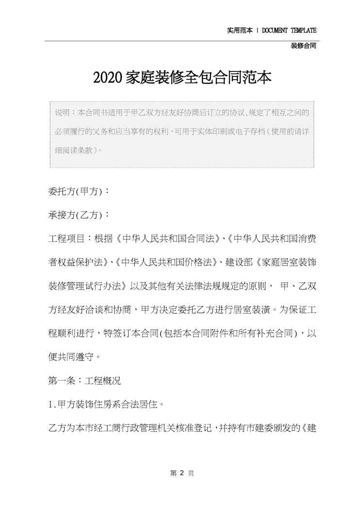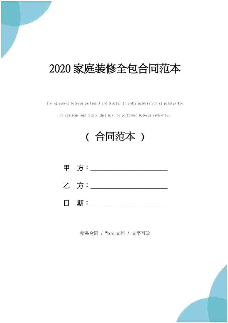 本站资深用户发布了最新的《2020家庭装修全包合同范本》文档,以下内容为预览,详细内容可下载阅读。 声明:本站所有文章,如无特殊说明或标注,均为本站原创发布。任何个人或组织,在未征得本站同意时,禁止复制、盗用、采集、发布本站内容到任何网站、书籍等各类媒体平台。如若本站内容侵犯了原著者的合法权益,可联系我们进行处理。