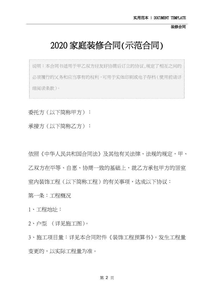 不久前,最新文档《2020家庭装修合同(示范合同)》全文正式在本站发布,感兴趣的用户可以下载阅读。 声明:本站所有文章,如无特殊说明或标注,均为本站原创发布。任何个人或组织,在未征得本站同意时,禁止复制、盗用、采集、发布本站内容到任何网站、书籍等各类媒体平台。如若本站内容侵犯了原著者的合法权益,可联系我们进行处理。