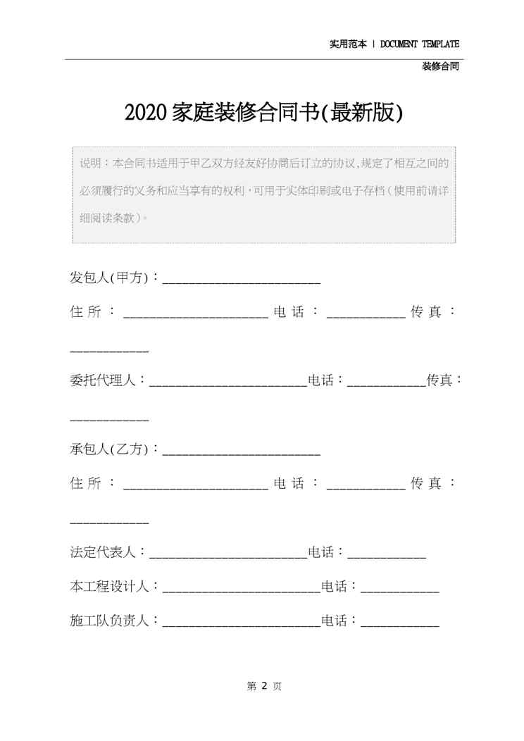 本站资深用户发布了最新的《2020家庭装修合同书(最新版)》文档,以下内容为预览,详细内容可下载阅读。 声明:本站所有文章,如无特殊说明或标注,均为本站原创发布。任何个人或组织,在未征得本站同意时,禁止复制、盗用、采集、发布本站内容到任何网站、书籍等各类媒体平台。如若本站内容侵犯了原著者的合法权益,可联系我们进行处理。