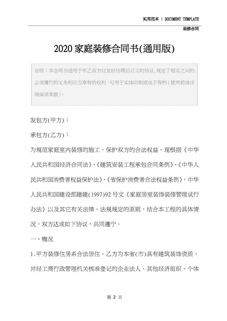 不久前,最新文档《2020家庭装修合同书(通用版)》全文正式在本站发布,感兴趣的用户可以下载阅读。 声明:本站所有文章,如无特殊说明或标注,均为本站原创发布。任何个人或组织,在未征得本站同意时,禁止复制、盗用、采集、发布本站内容到任何网站、书籍等各类媒体平台。如若本站内容侵犯了原著者的合法权益,可联系我们进行处理。