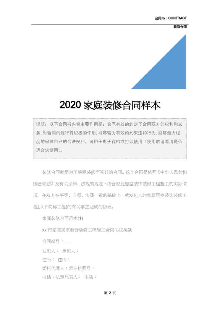 本站资深用户发布了最新的《2020家庭装修合同样本》文档,以下内容为预览,详细内容可下载阅读。 声明:本站所有文章,如无特殊说明或标注,均为本站原创发布。任何个人或组织,在未征得本站同意时,禁止复制、盗用、采集、发布本站内容到任何网站、书籍等各类媒体平台。如若本站内容侵犯了原著者的合法权益,可联系我们进行处理。