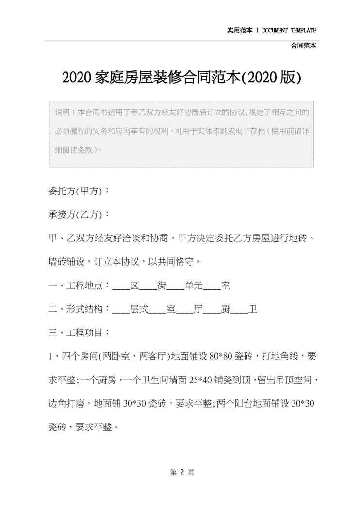 本站正式发布了《2020家庭房屋装修合同范本(2020版)》文档,文档详细内容可下载阅读。 声明:本站所有文章,如无特殊说明或标注,均为本站原创发布。任何个人或组织,在未征得本站同意时,禁止复制、盗用、采集、发布本站内容到任何网站、书籍等各类媒体平台。如若本站内容侵犯了原著者的合法权益,可联系我们进行处理。