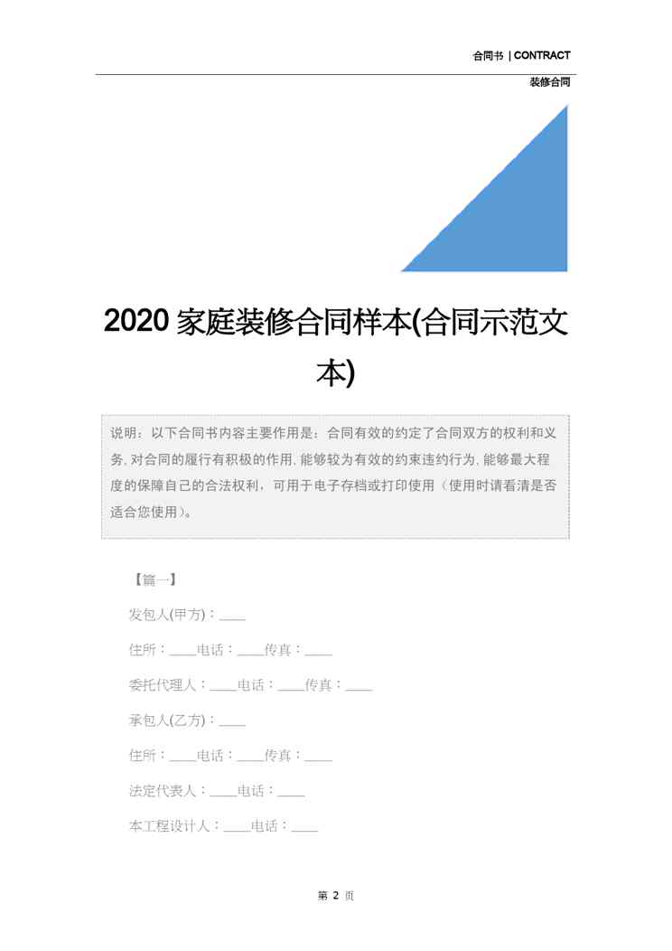 本站正式发布了《2020家庭装修合同样本(合同示范文本)》文档,文档详细内容可下载阅读。 声明:本站所有文章,如无特殊说明或标注,均为本站原创发布。任何个人或组织,在未征得本站同意时,禁止复制、盗用、采集、发布本站内容到任何网站、书籍等各类媒体平台。如若本站内容侵犯了原著者的合法权益,可联系我们进行处理。